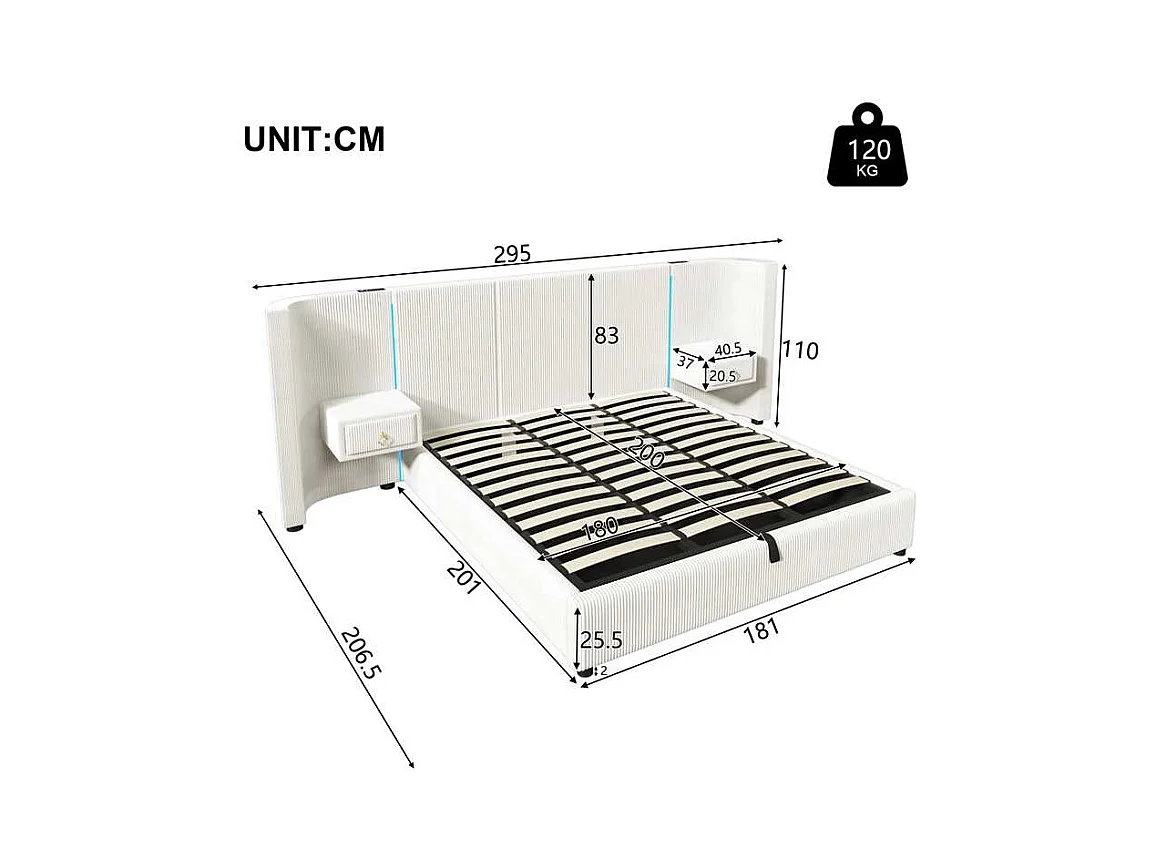 Lit rembourré double 180 x 200 cm - 4 tiroirs et LED - en tissu velours - Beige