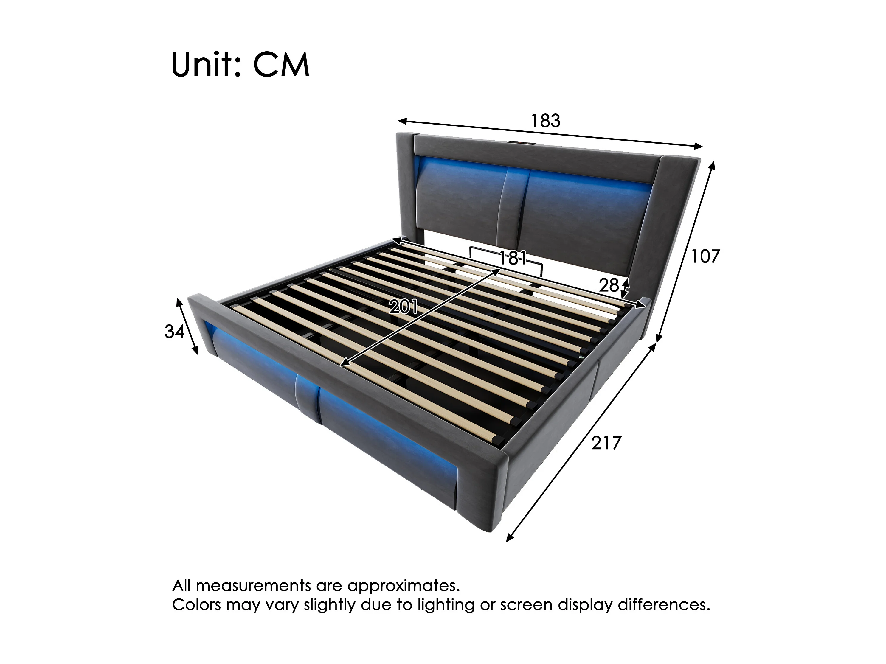 Lit coffre rembourré 180x200cm - avec éclairage LED - avec ports USB et Type-C - velours - Gris (sans matelas)