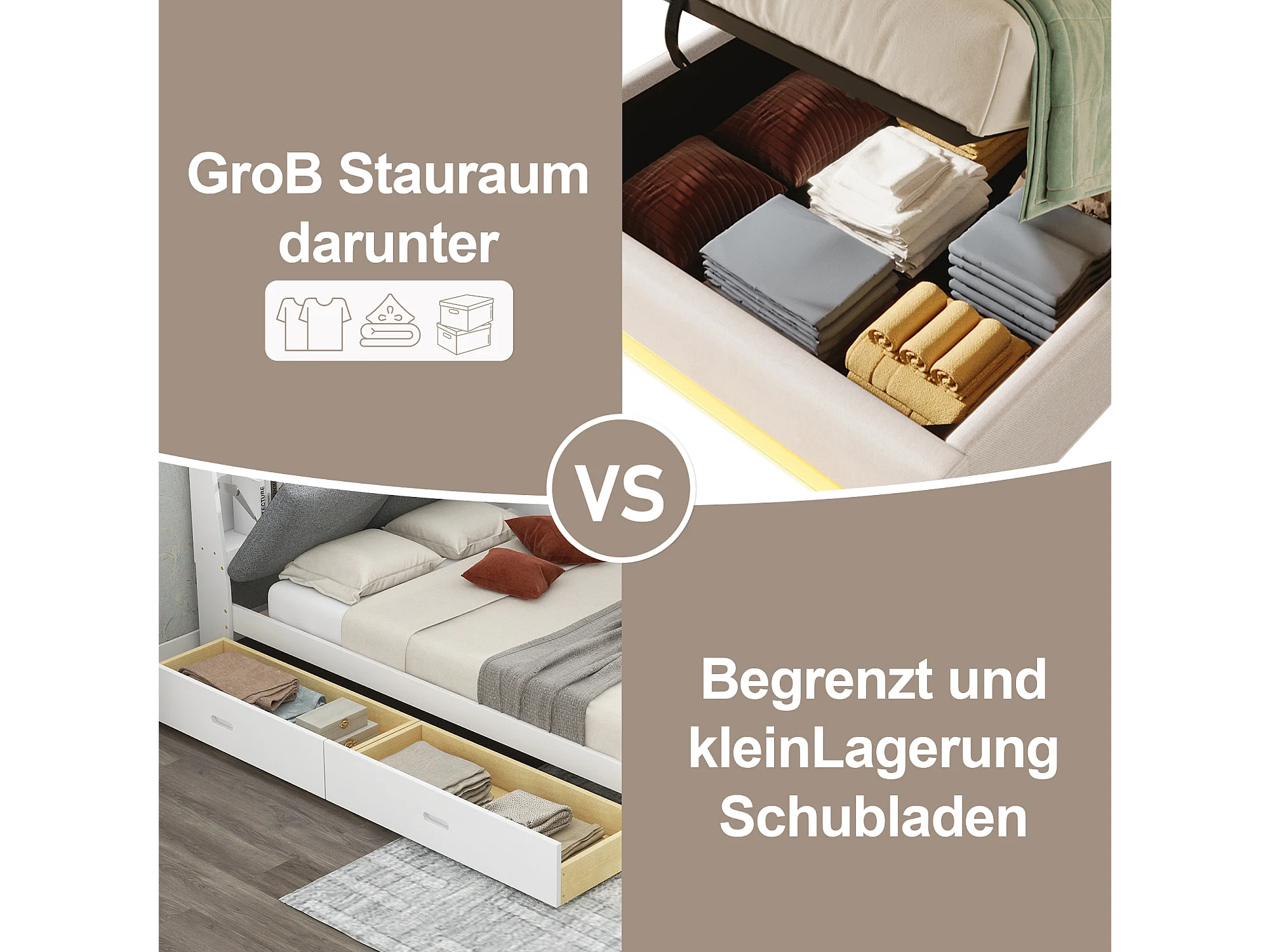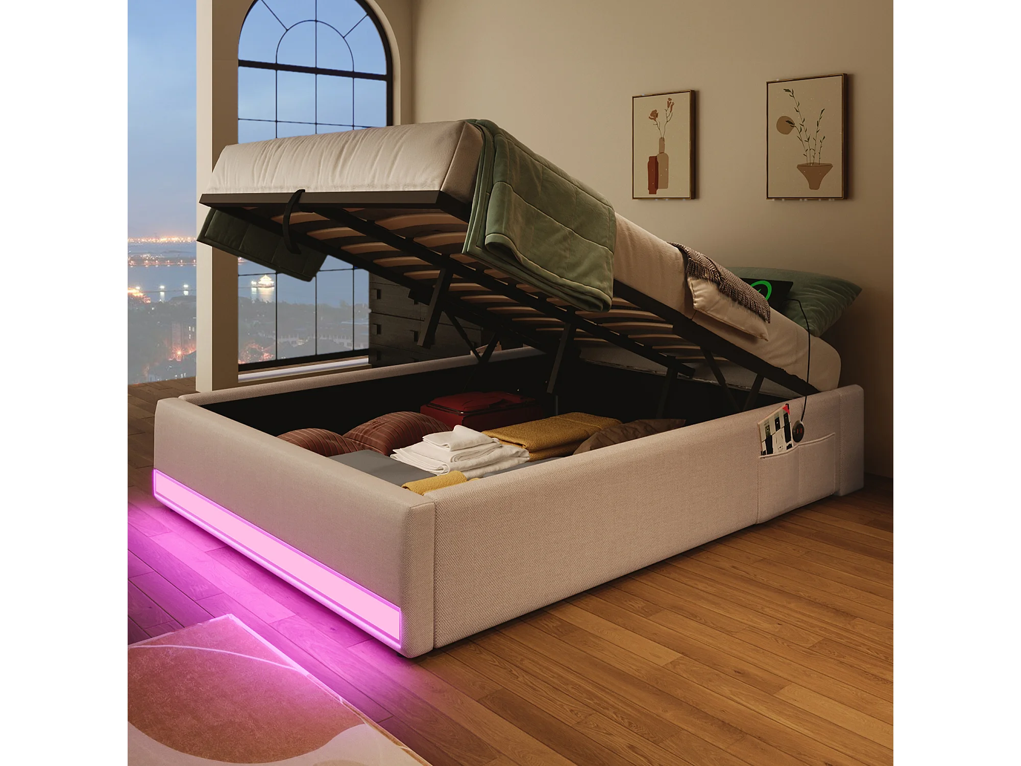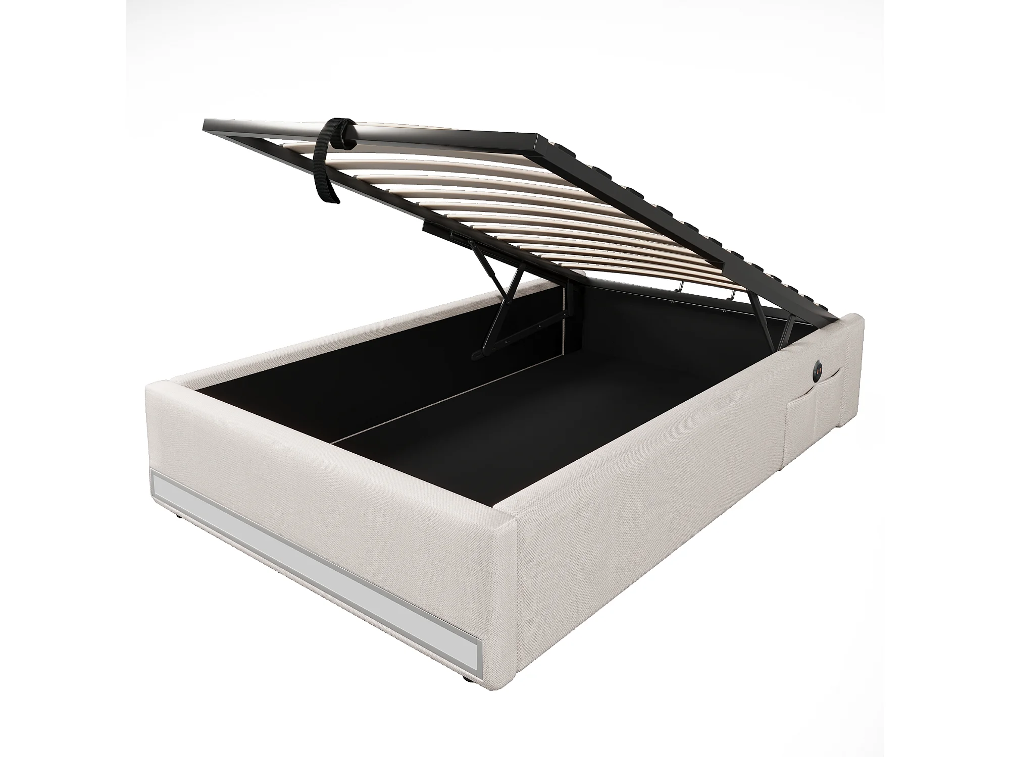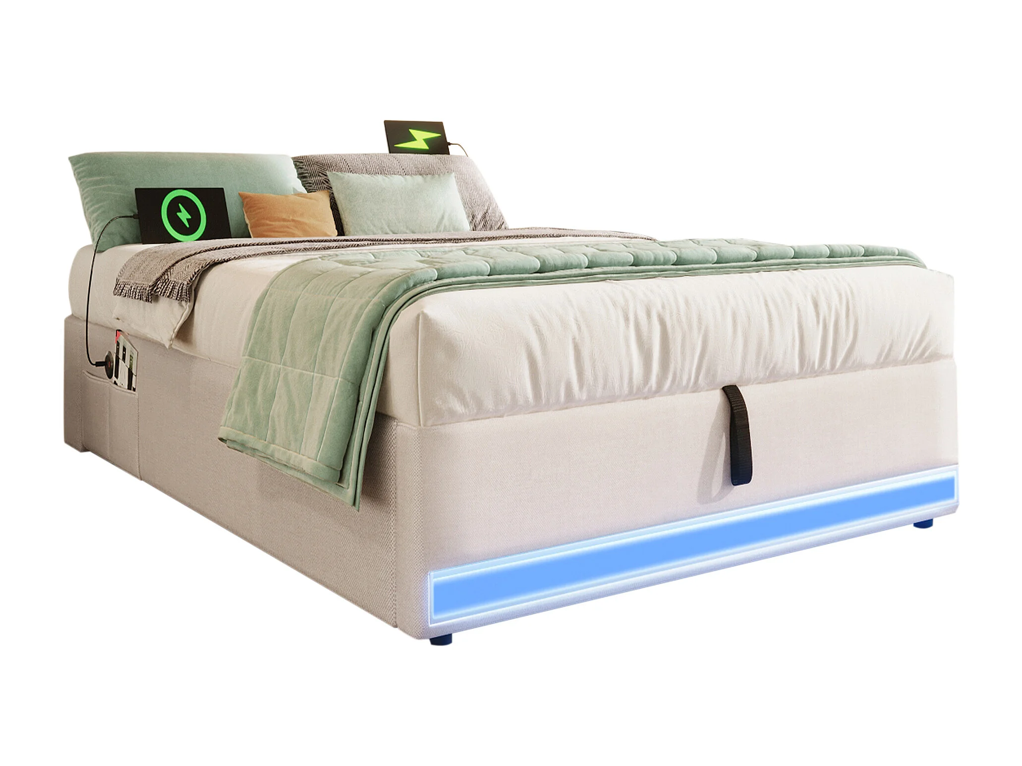 Lit coffre rembourré - 90 x 200 cm - avec Leds + USB + Type-C - sans tête de lit - lin + MDF - beige
