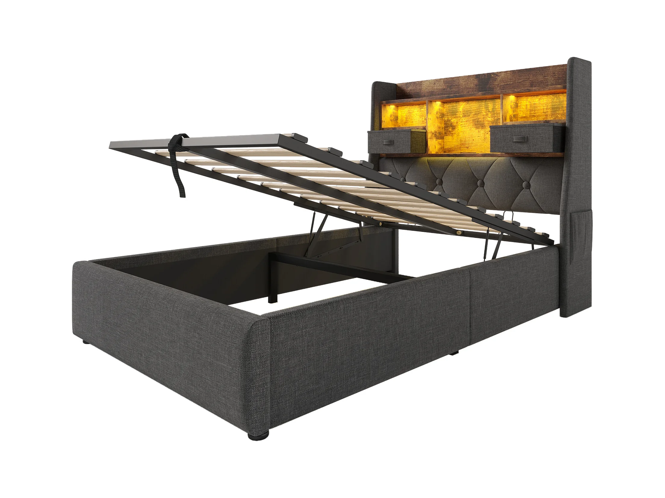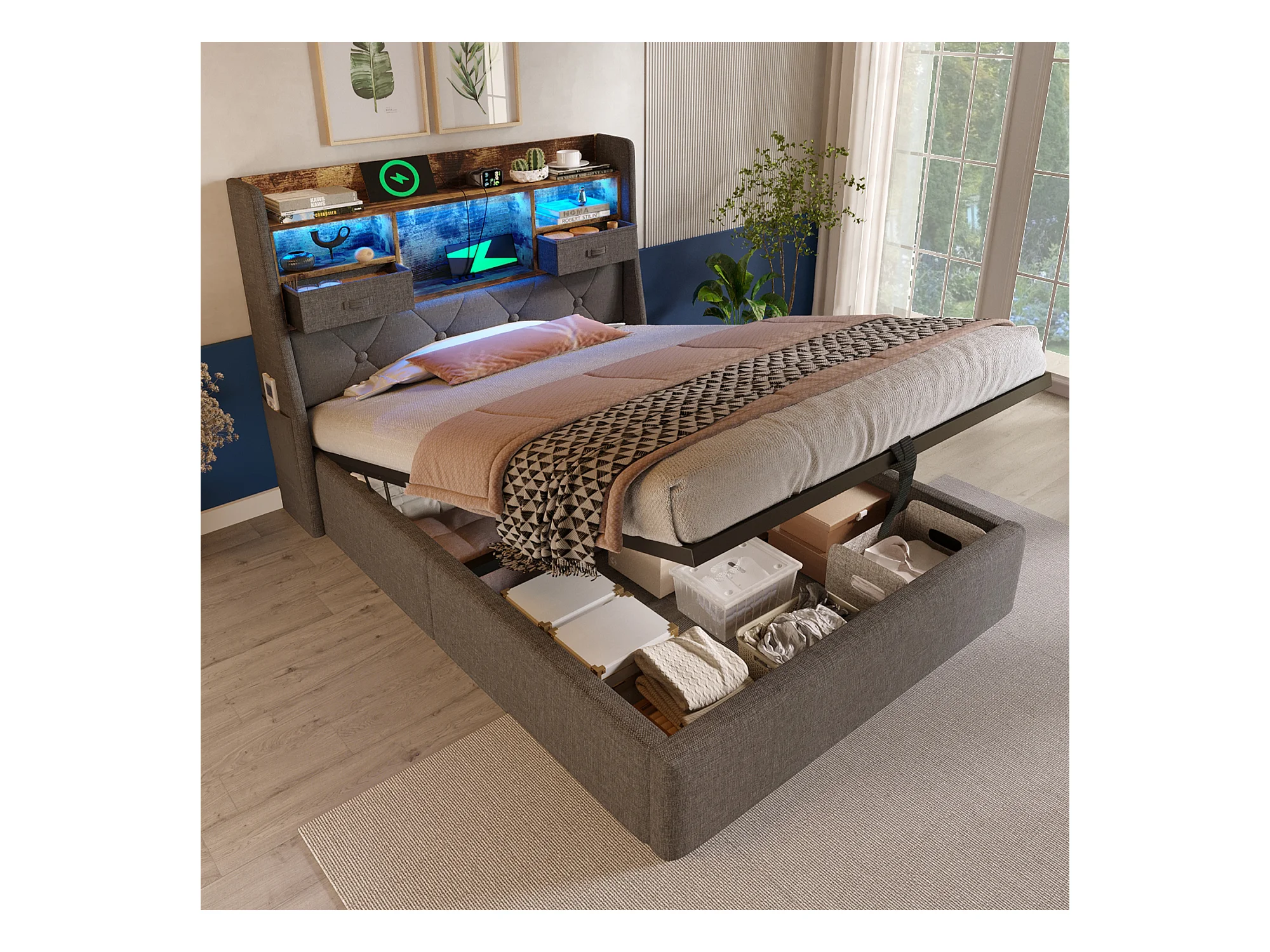 Lit coffre rembourré 90x200cm - avec LED - avec 4 prises de charge (USB/Type-C) - tête de lit avec rangement - lin - Gris (sans matelas)