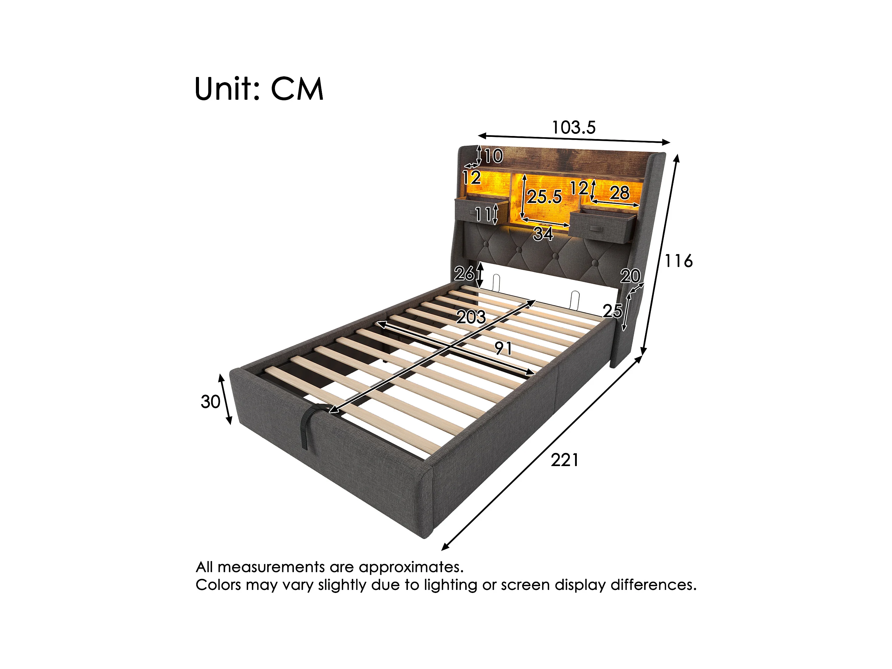 Lit coffre rembourré 90x200cm - avec Lumière LED - Lin - Gris (sans matelas)