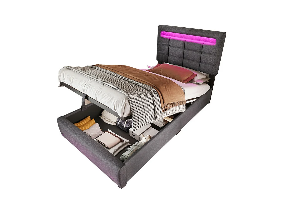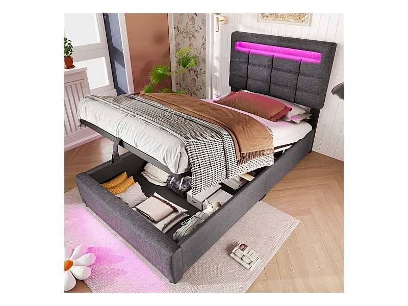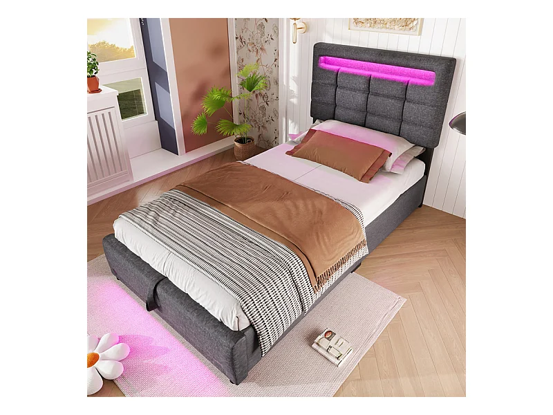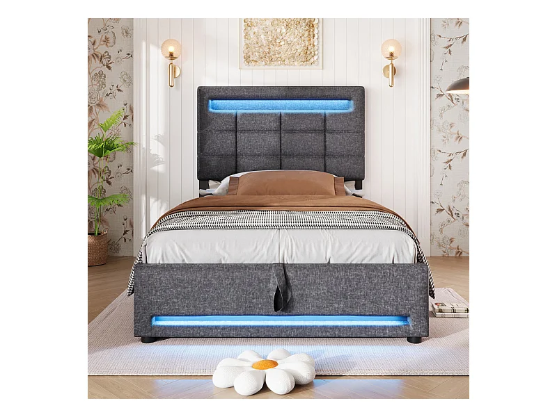 Lit coffre rembourré 90x200cm - avec LED - avec 4 prises de charge (USB/Type-C) - tête de lit avec rangement - lin - Gris (sans matelas)