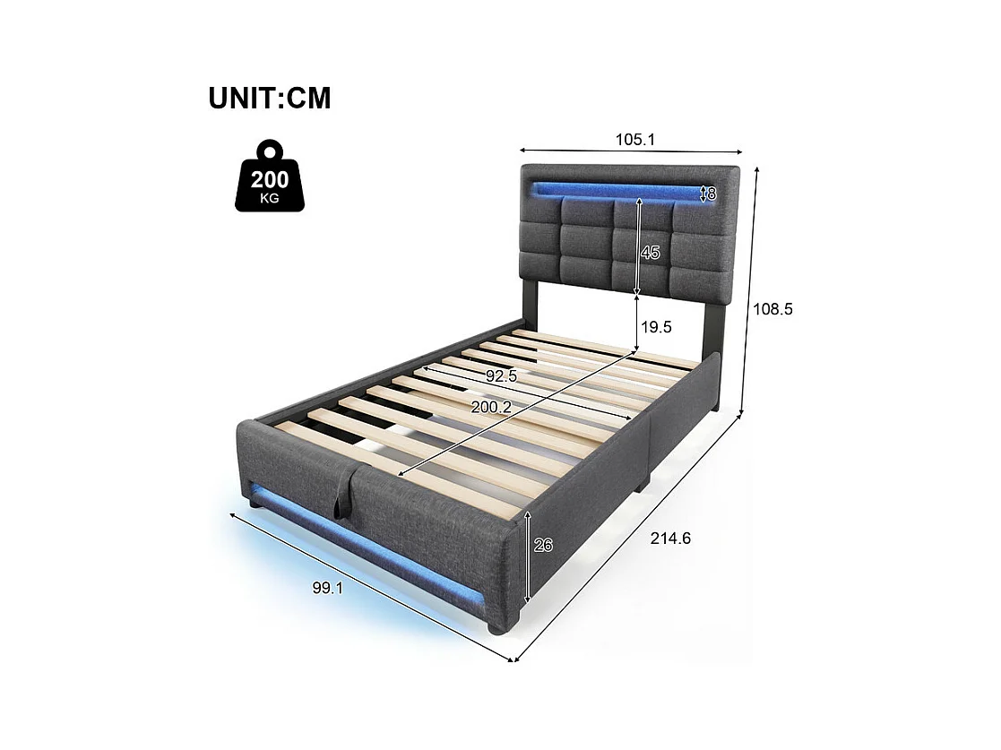 Lit coffre rembourré 90x200cm - avec éclairage LED - avec ports USB et Type-C - tissu en Lin - Gris (sans matelas)