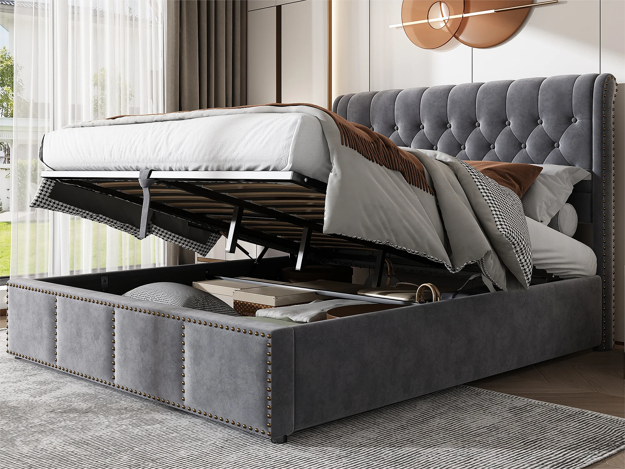 Lit coffre rembourré en velours - décoré de rivets - avec sommier à lattes - 140x190cm - Gris