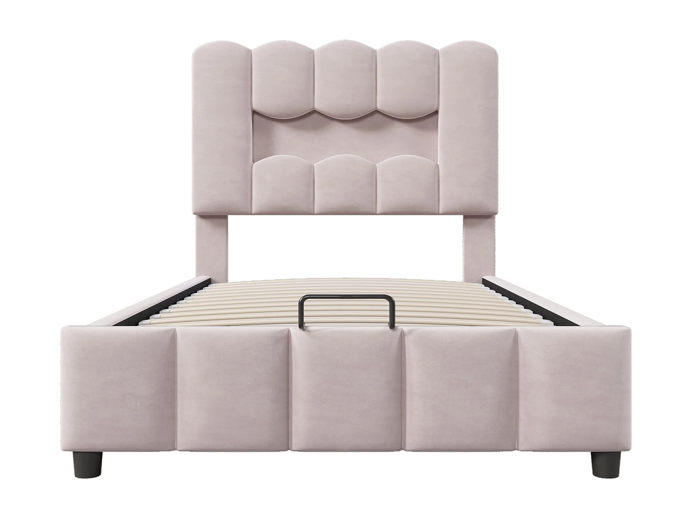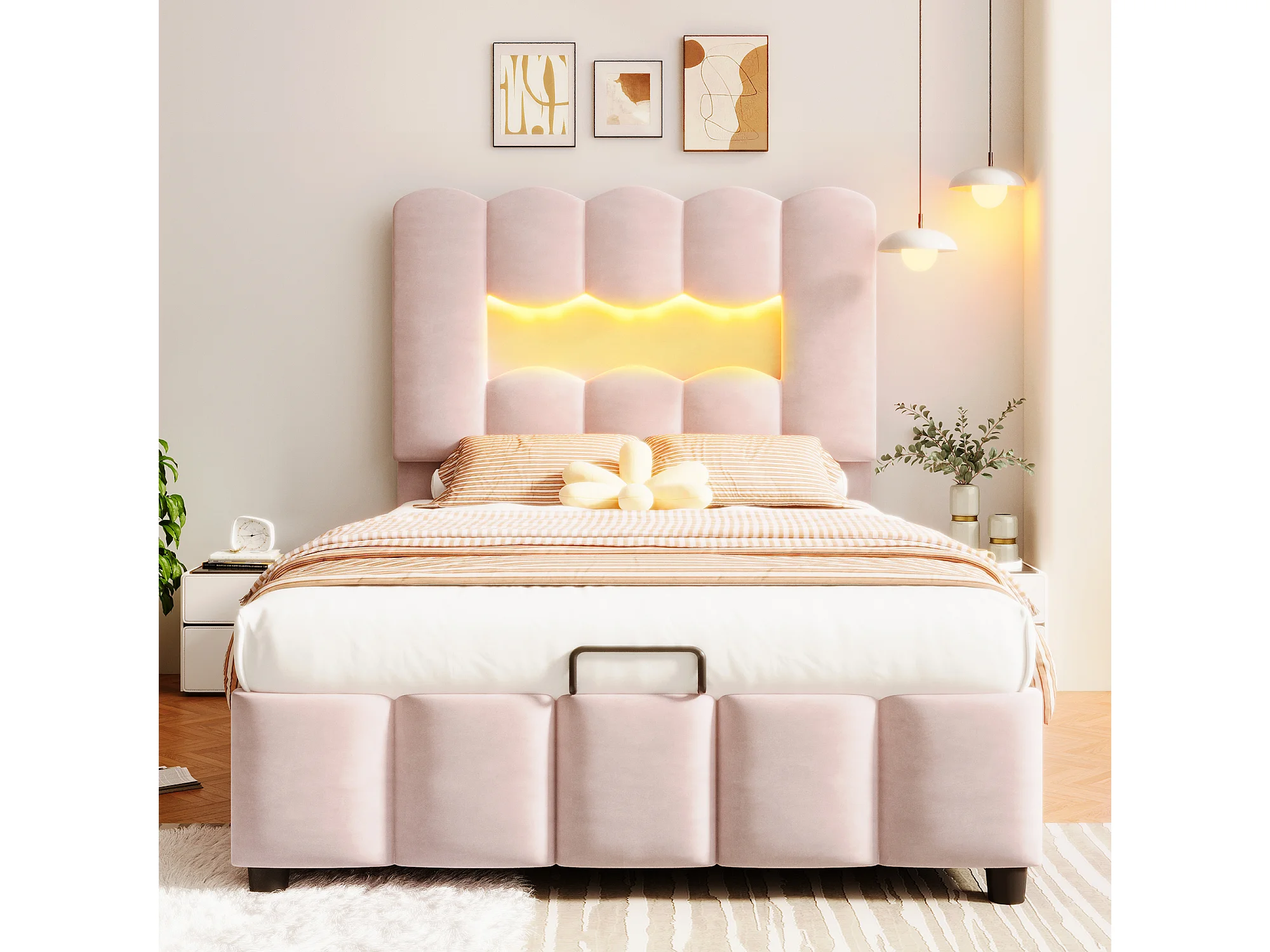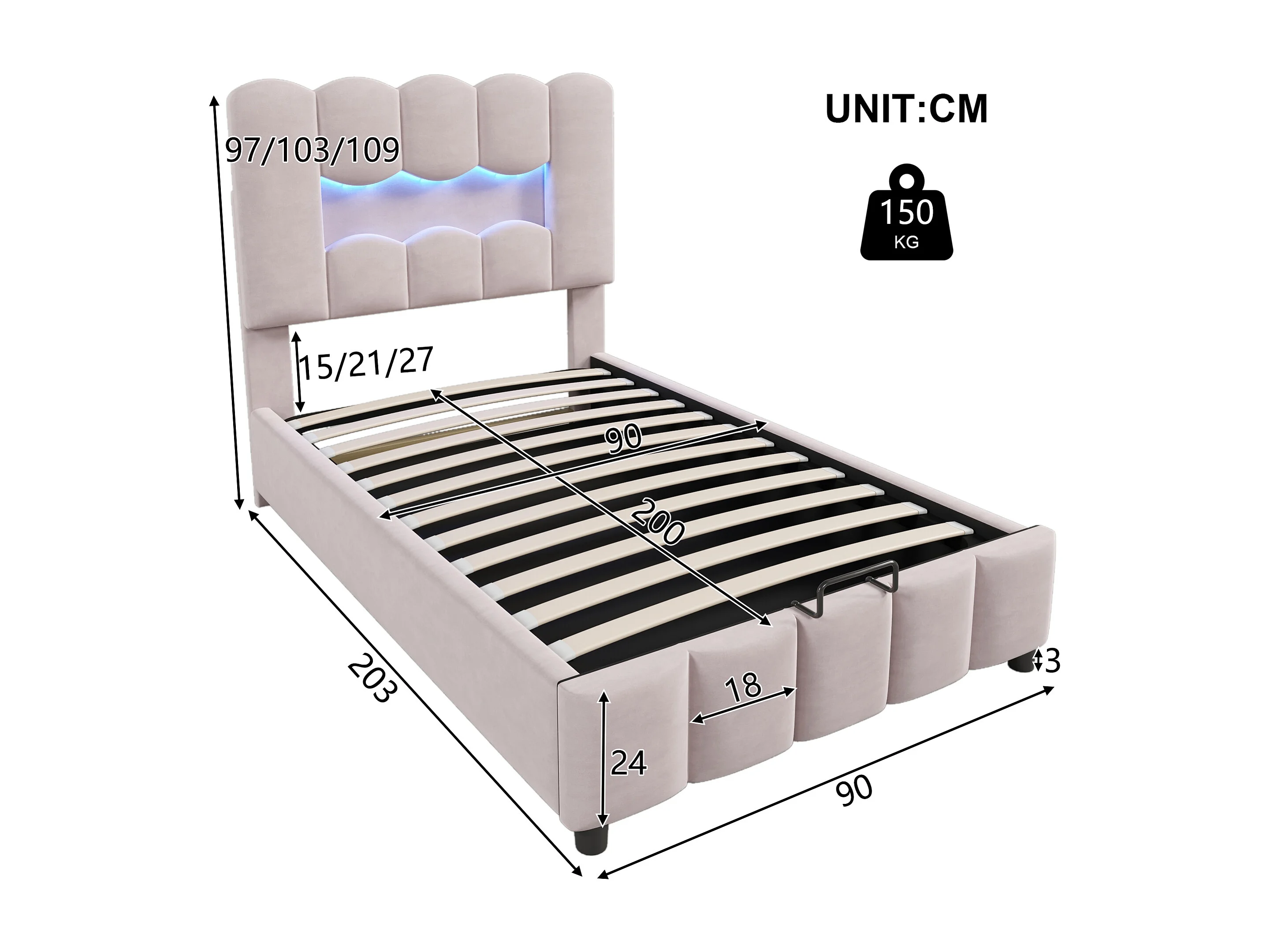 Lit coffre simple 90x200 cm avec éclairage LED et tête de lit réglable, velours rose - sans matelas