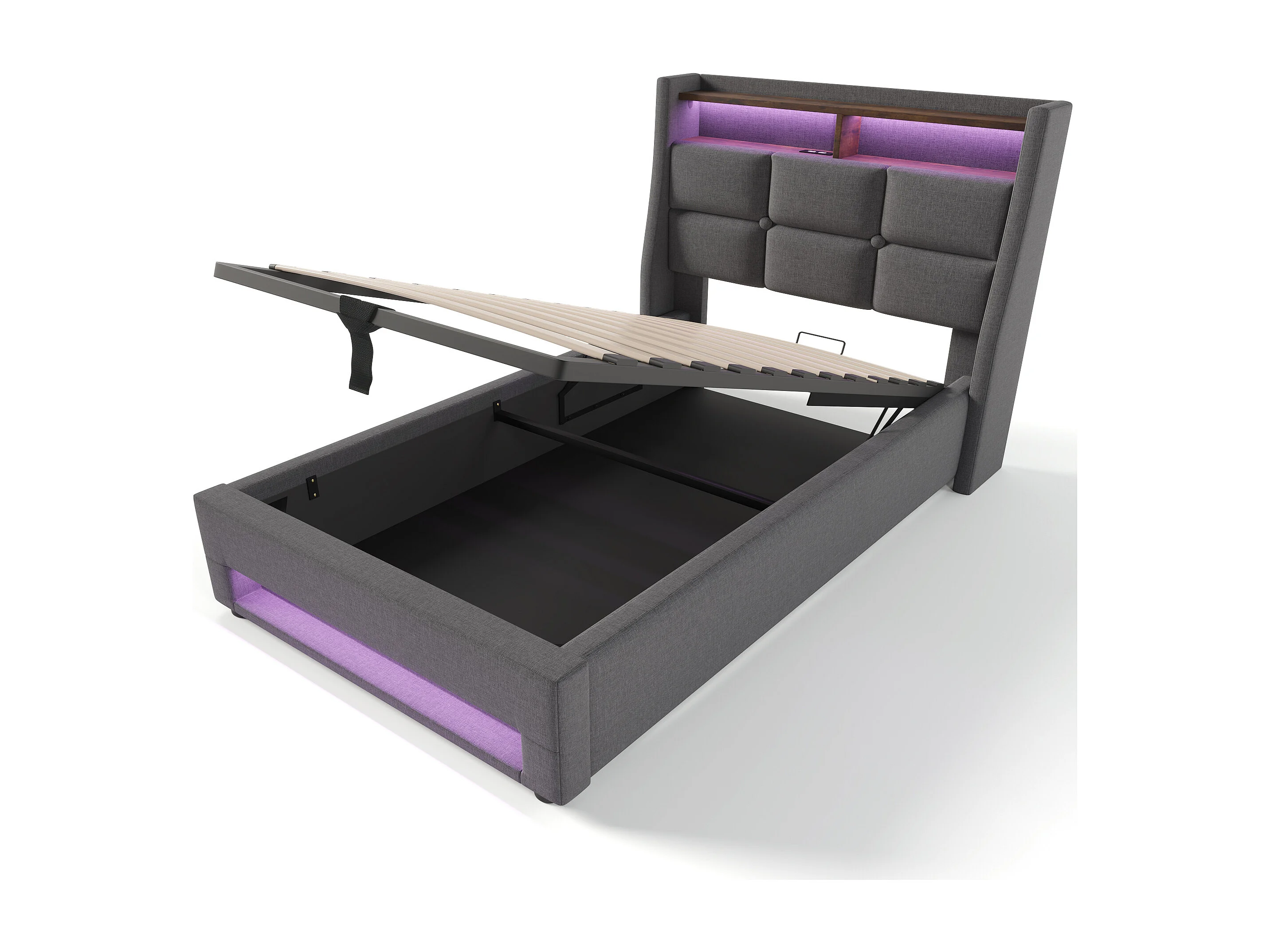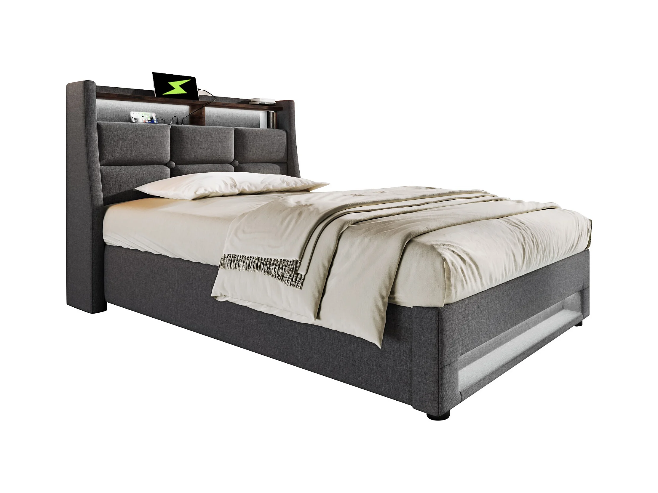 Lit coffre enfant 90x200 cm avec USB et éclairage LED, cadre en métal et lin (sans matelas)