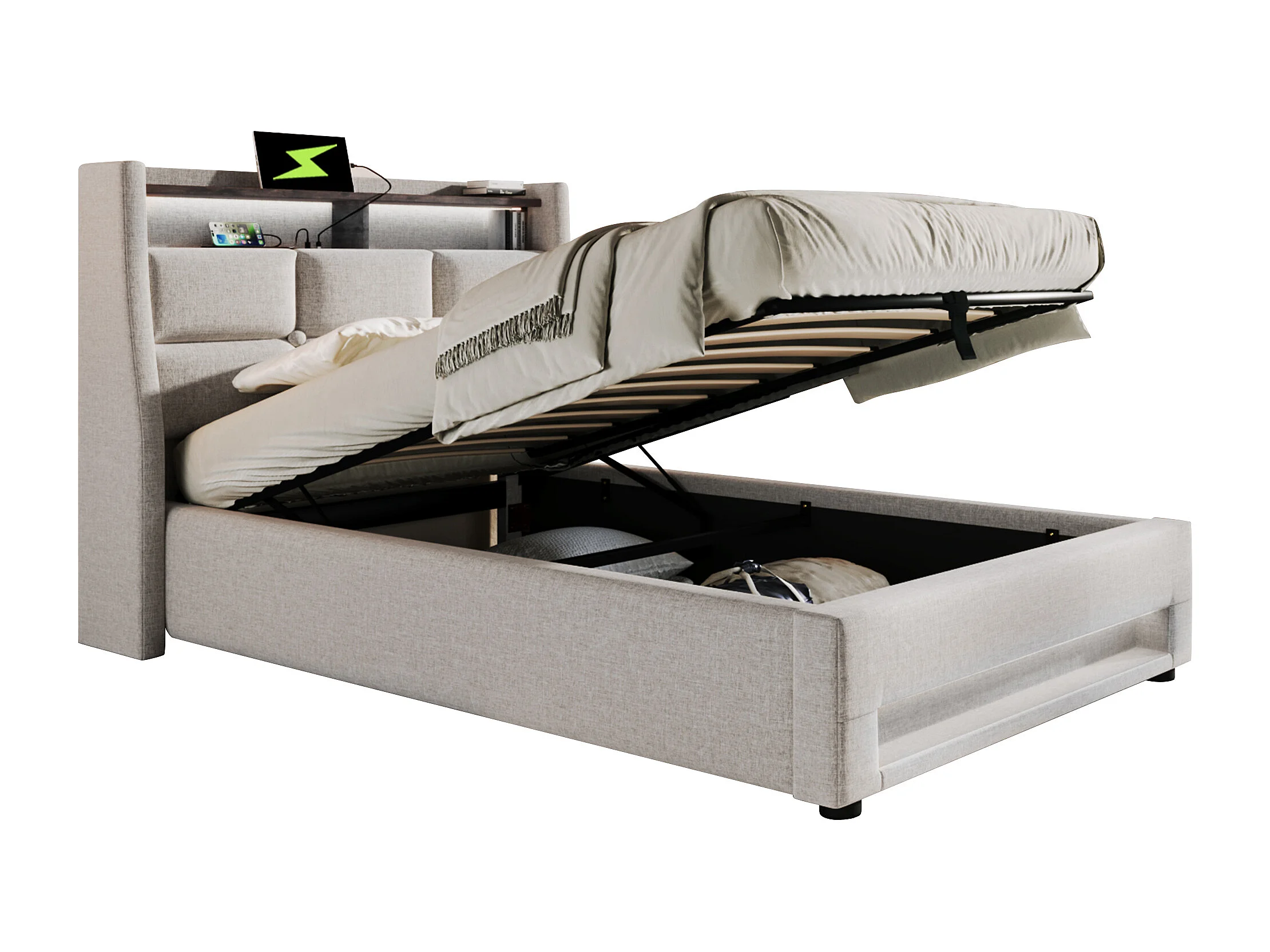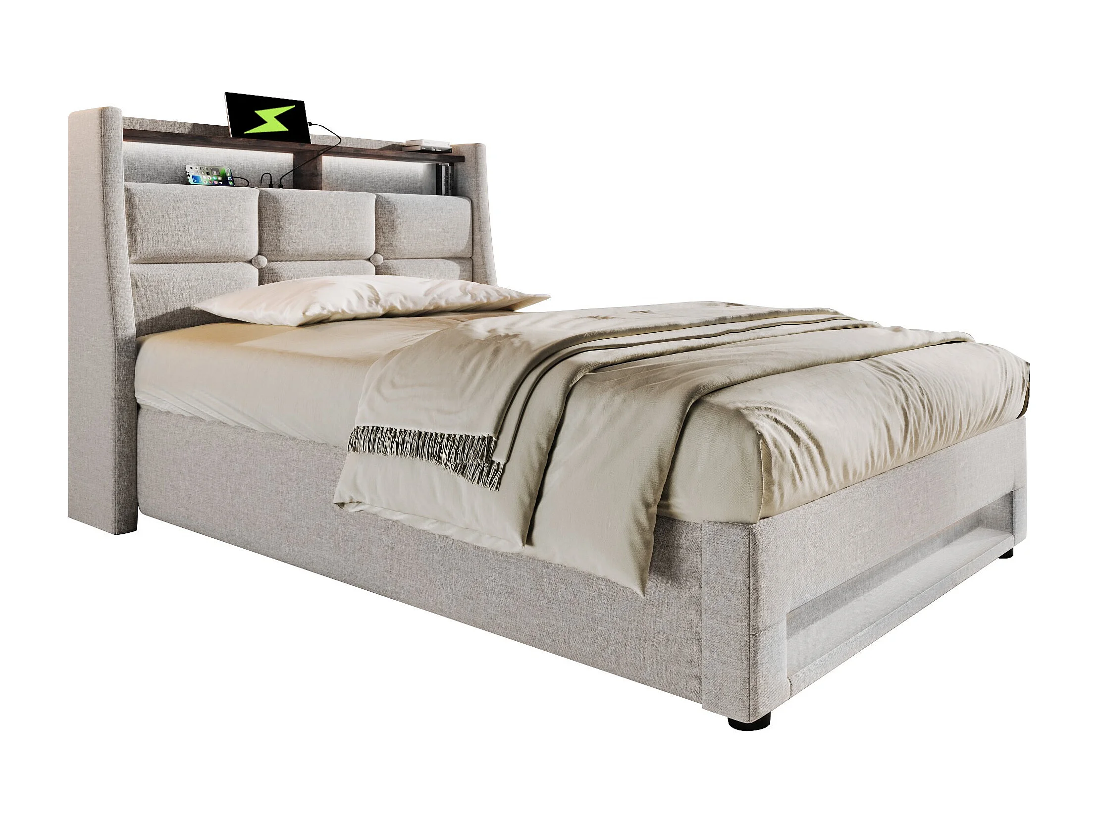 Lit coffre adulte 90x200 cm avec USB et éclairage LED, cadre métallique et en lin beige(sans matelas)