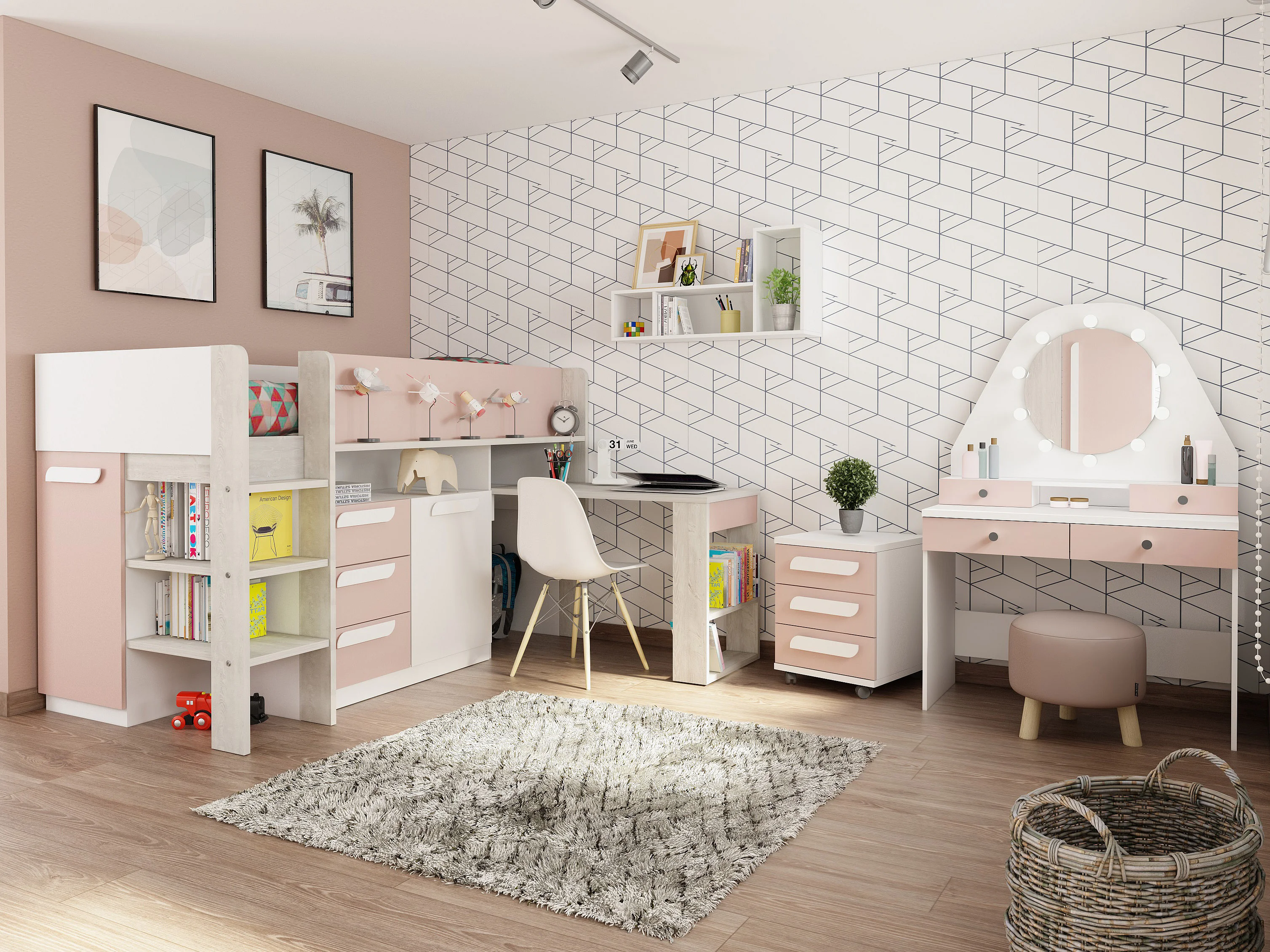 Lit combiné 90 x 200 cm - Avec bureau et rangements - Rose, naturel et blanc - LOUKALA