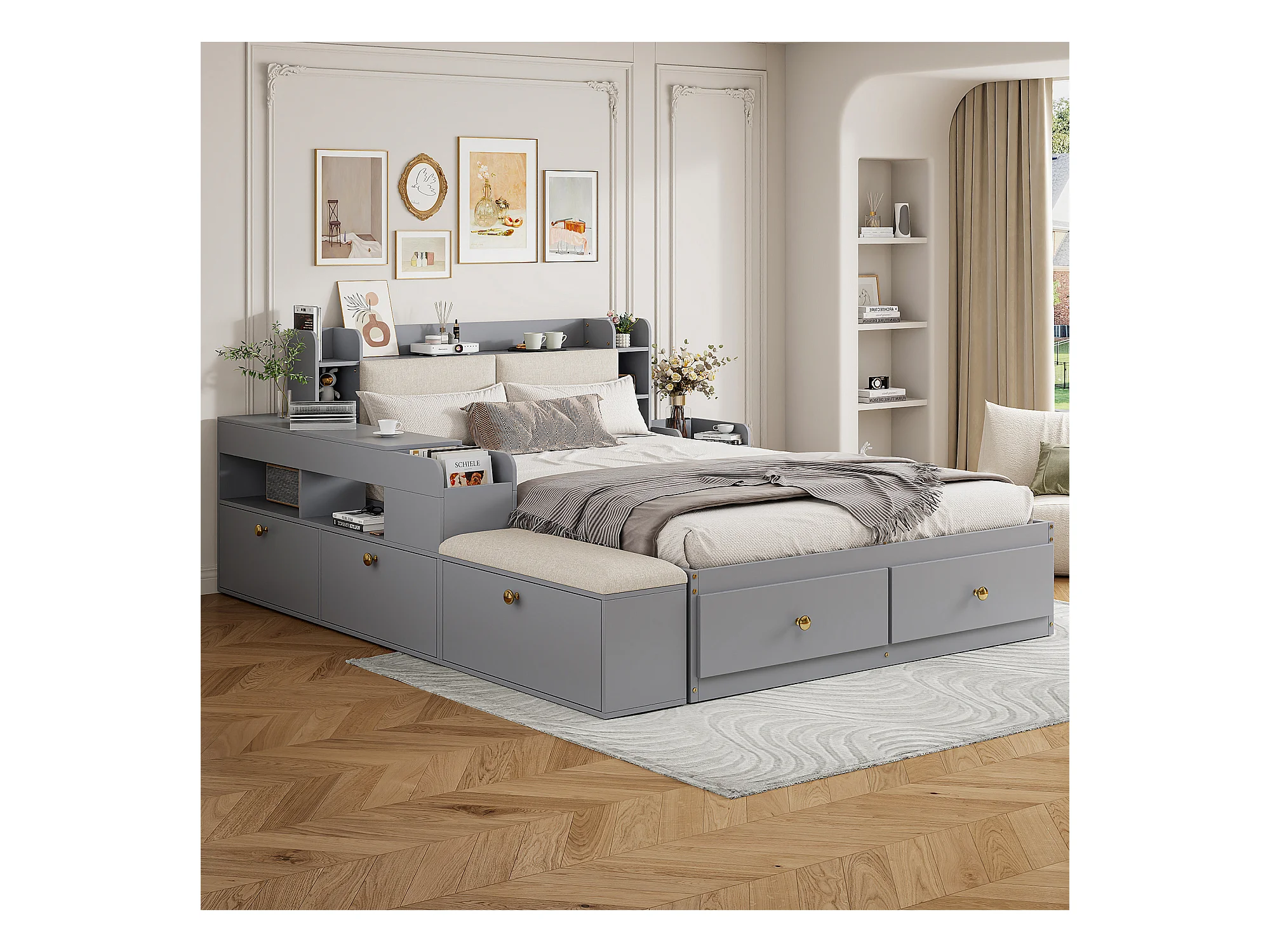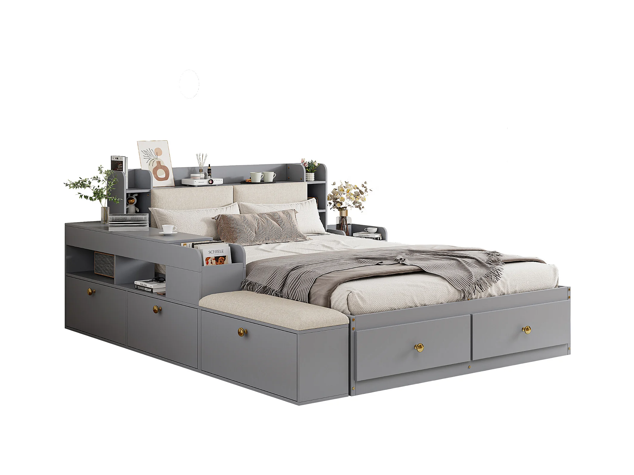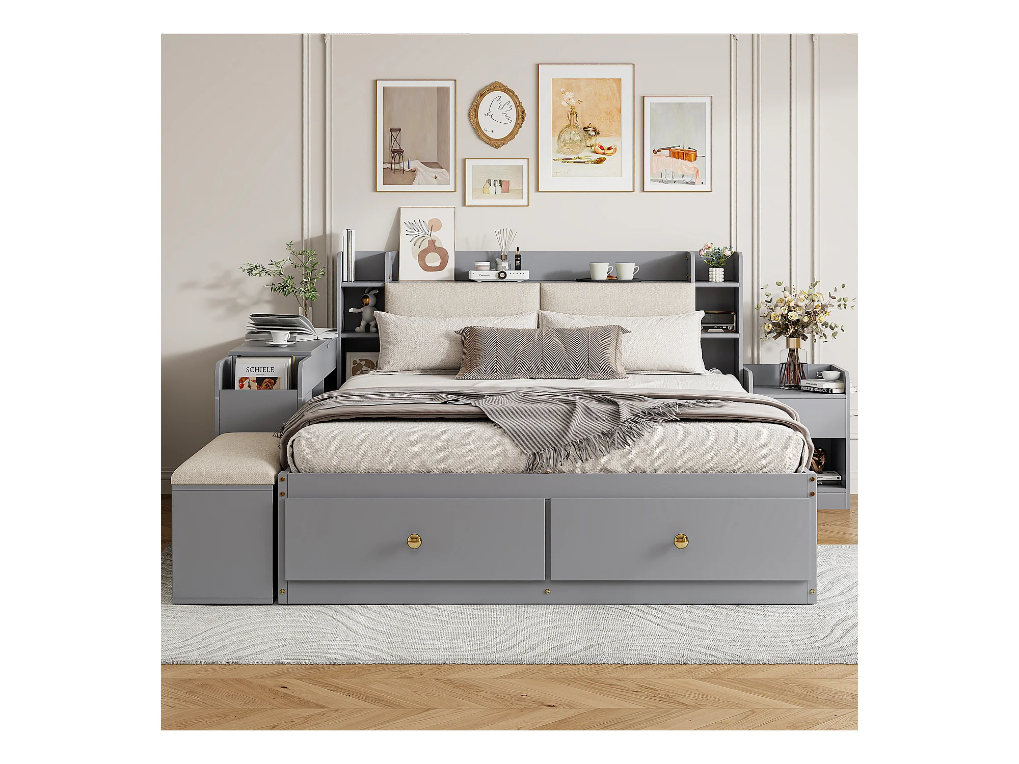 Lit combiné en bois massif 140x200 cm, tête de lit avec rangements, tiroirs, table de nuit, armoire, canapé de rangement, gris (227x145x91 cm)