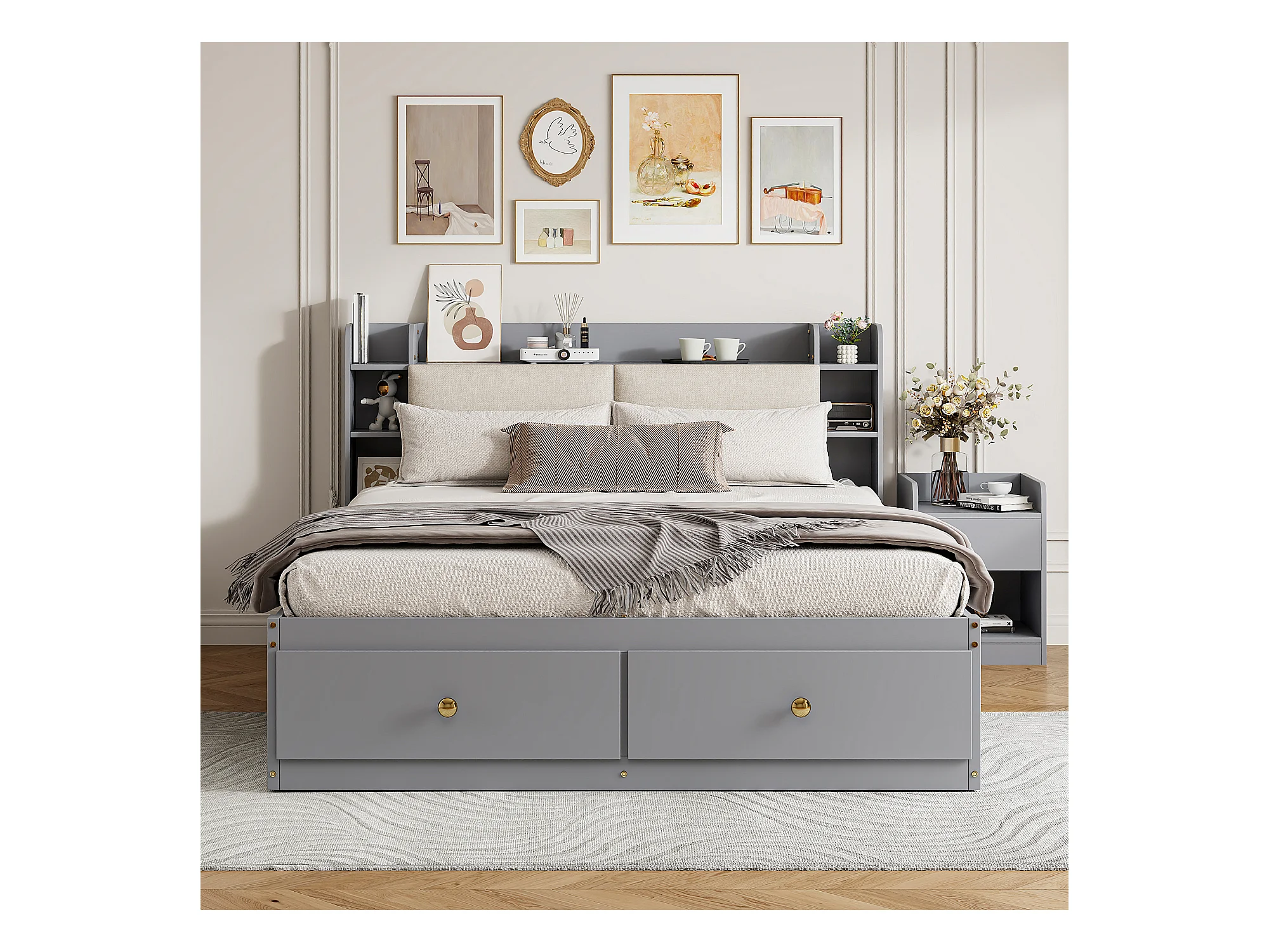 Canapé-lit bois massif 140x200 cm, tiroirs extra-larges, USB, LED, étagères, rangement, gris (222.3x165x92 cm)