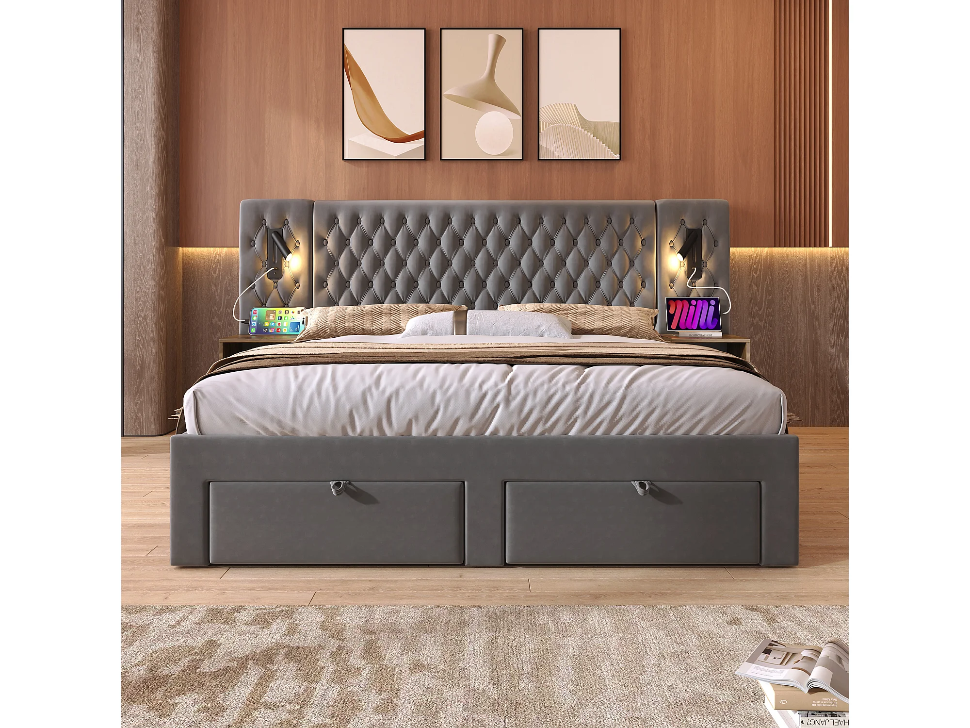 Lit complet chambre double 160×200 avec 2 tables de nuit, 4 tiroirs, tête lumineuse USB, velours gris (avec matelas)