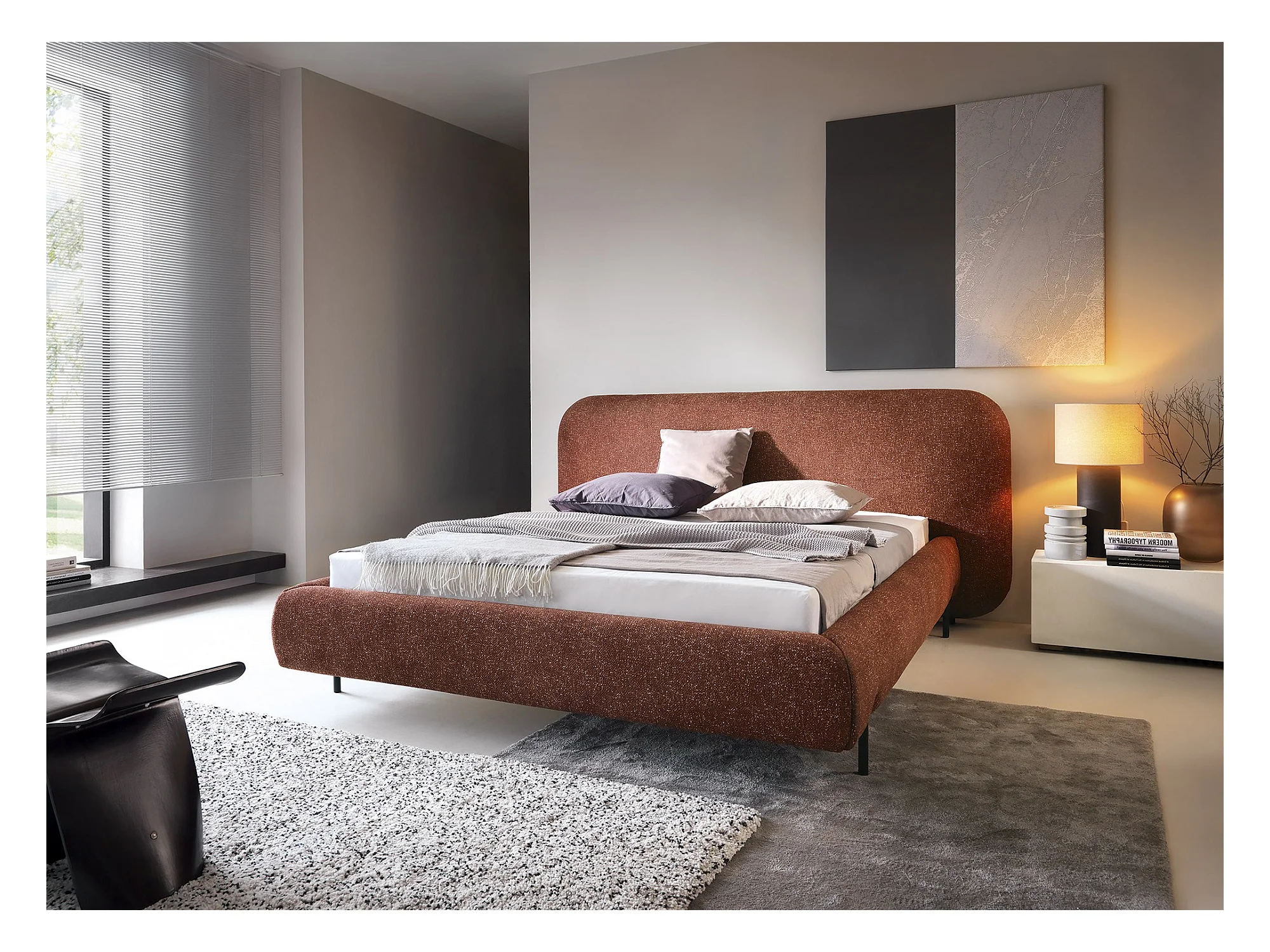 Lit rembourré Marco avec tête de lit, 140 x 200 cm, lit double avec coffre de rangement et sommier à lattes en métal, tissu bouclé, couleur : marron