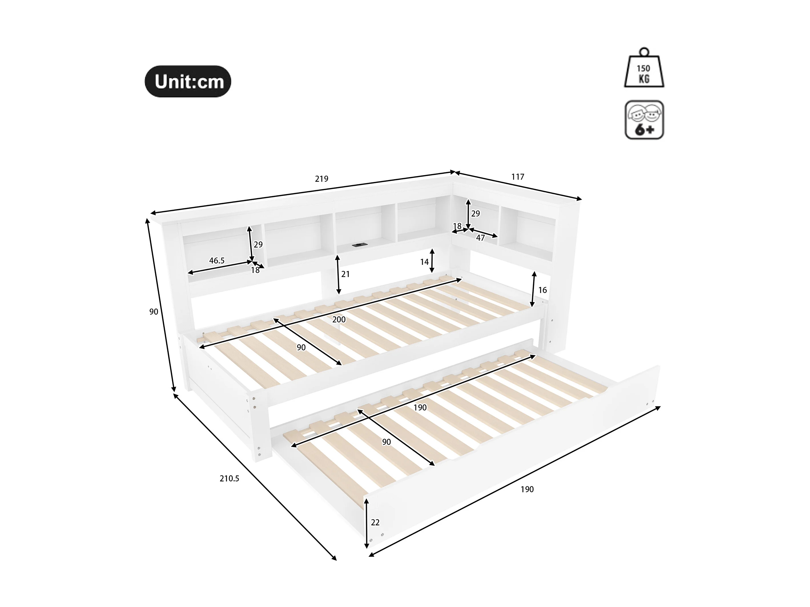 Lit Daybed 90x200 cm, canapé-lit avec lit escamotable, avec prise de courant et 2 ports USB, pin, blanc (219x117x90 cm)