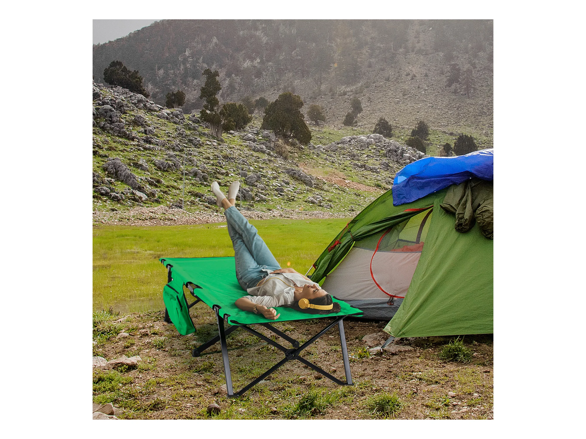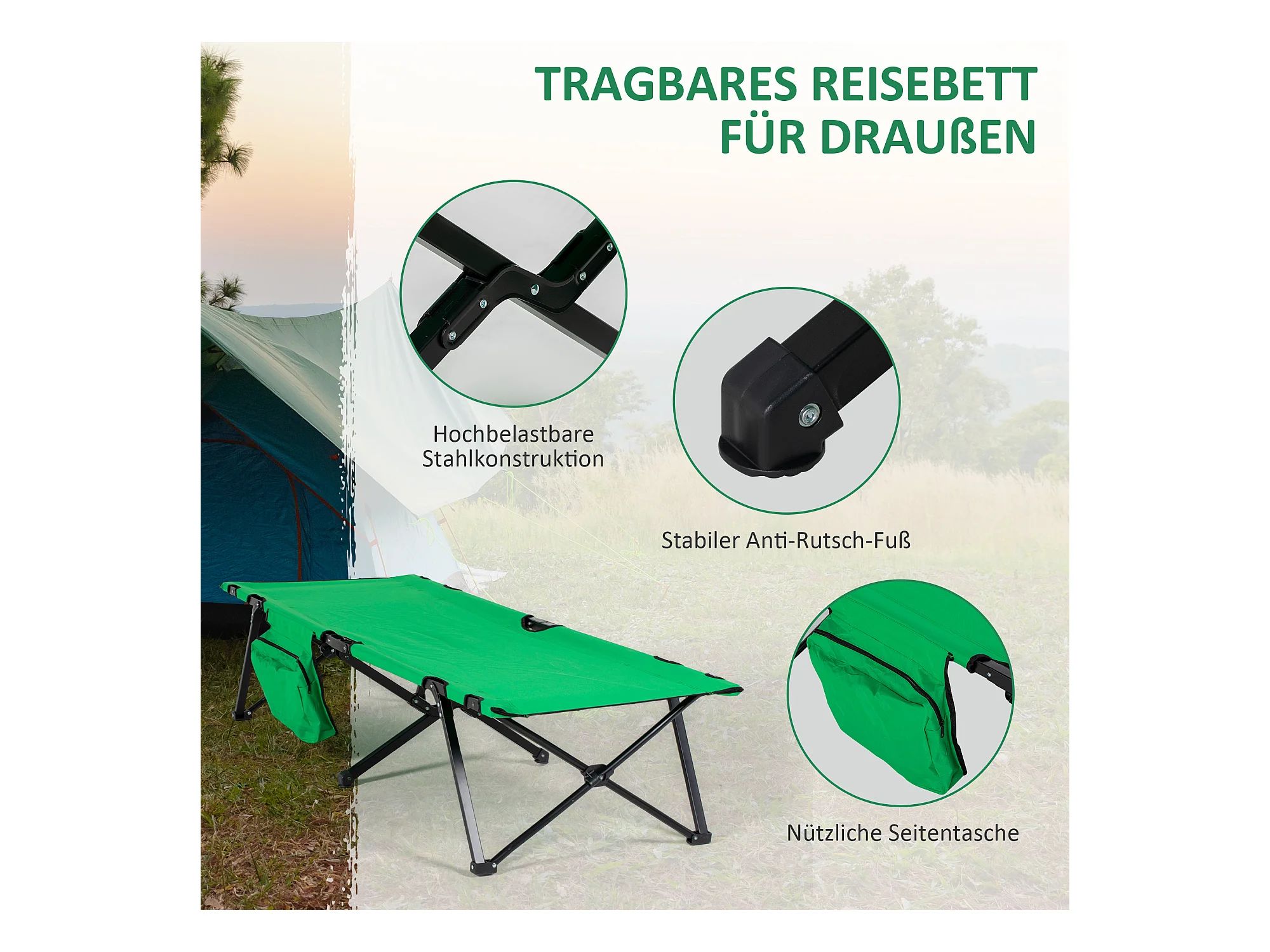 Lit de camping pliable, avec rangement, acier, vert et noir (190x65x40 cm)