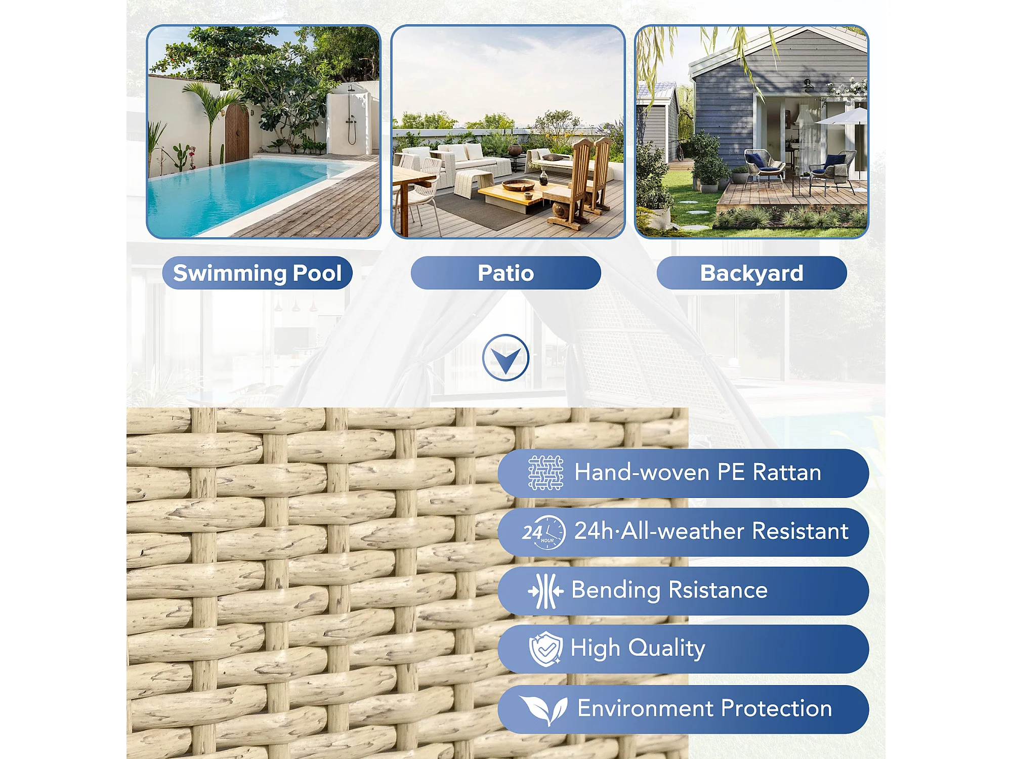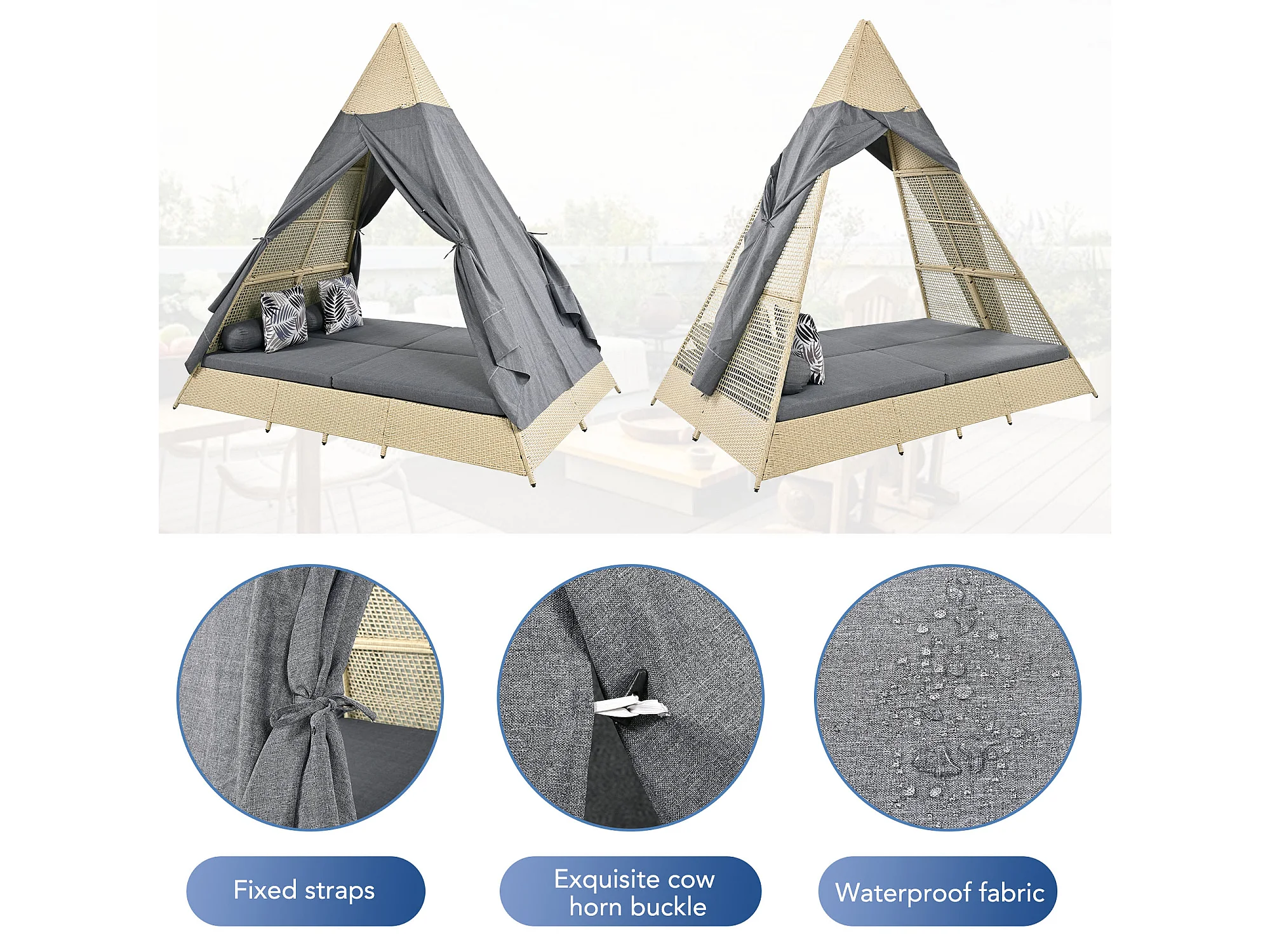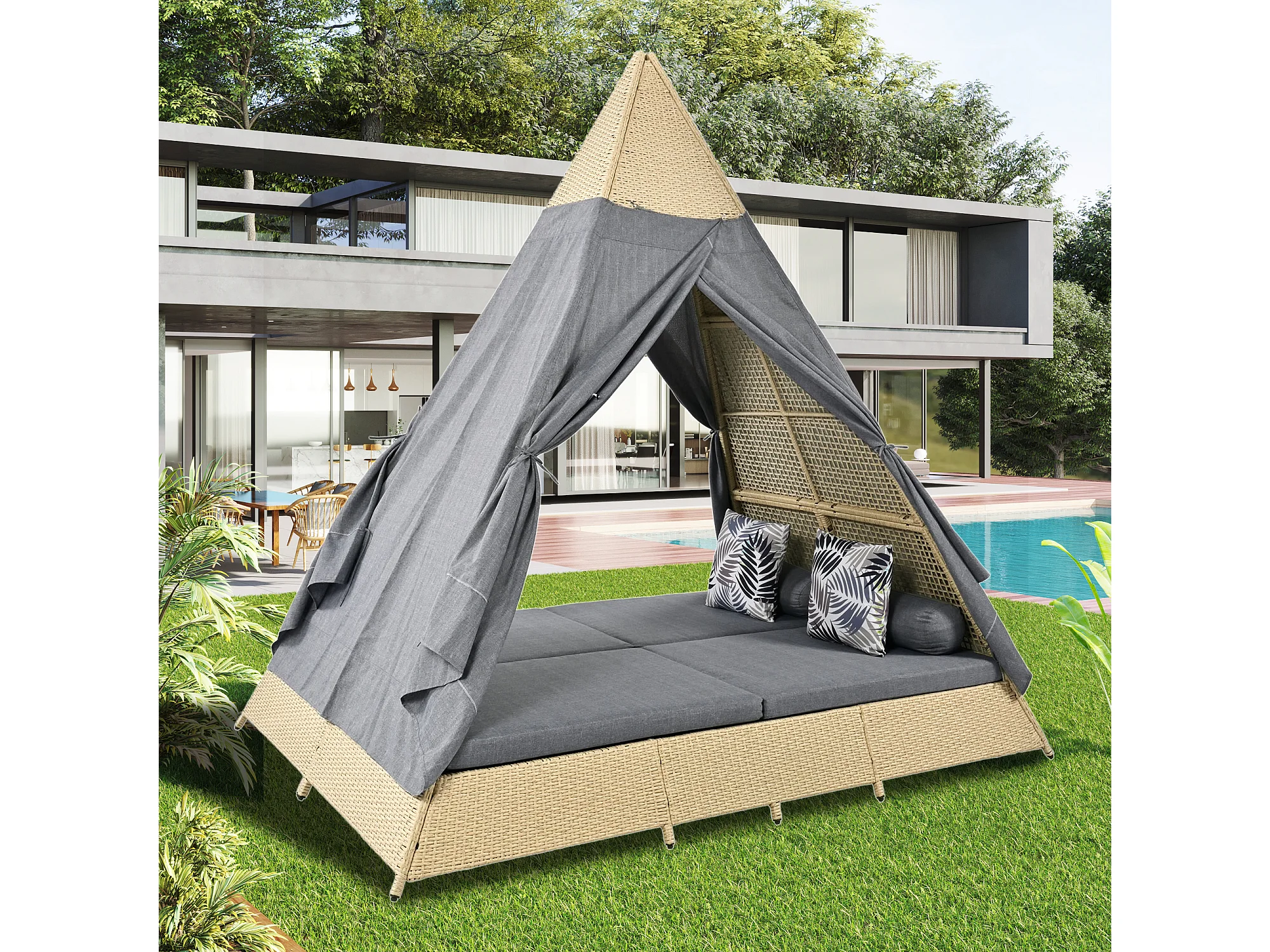 Lit de jardin à baldaquin 2 à 4 places - Rotin beige et rideau de porte gris - Coussins inclus - pour extérieur