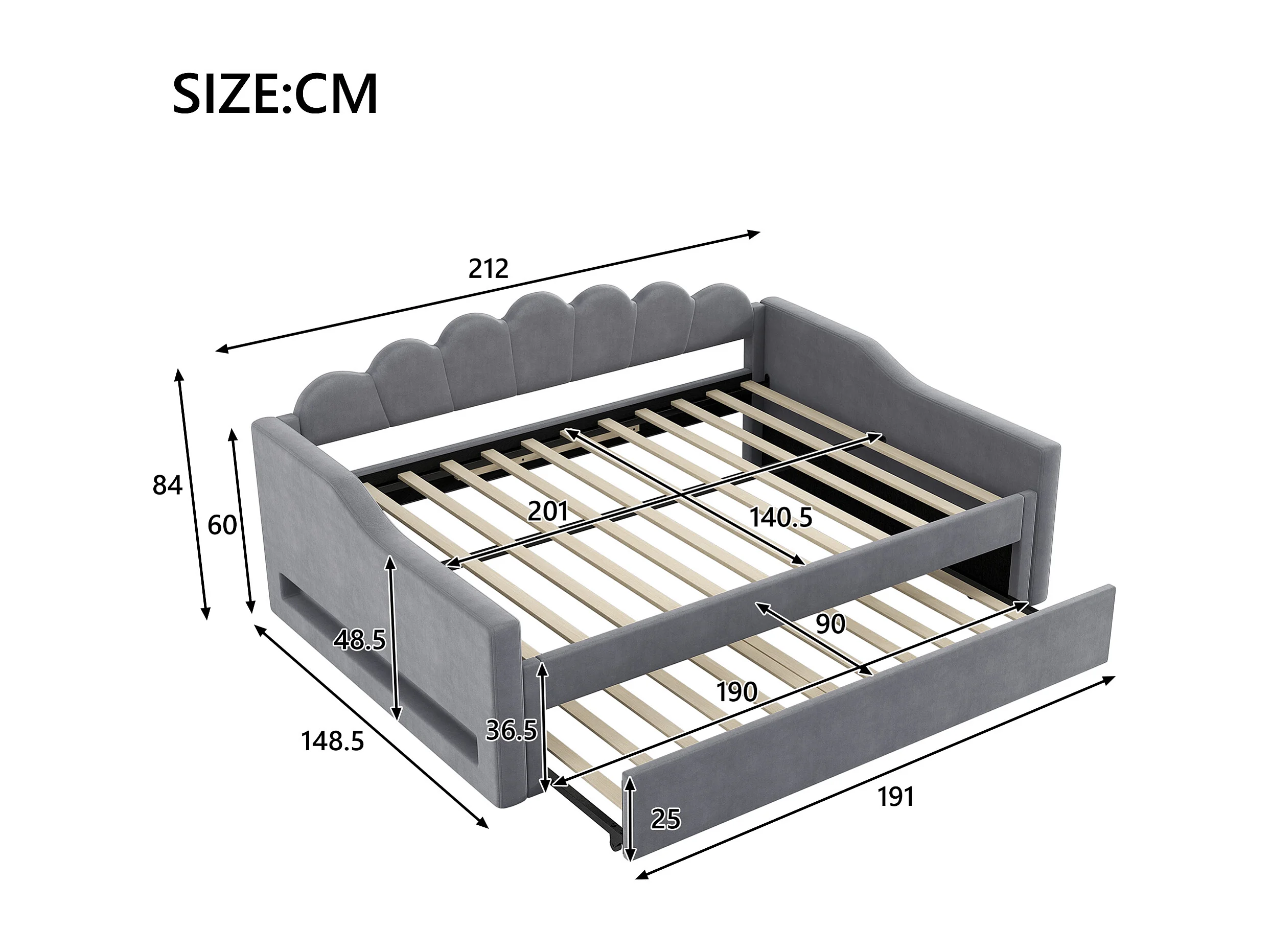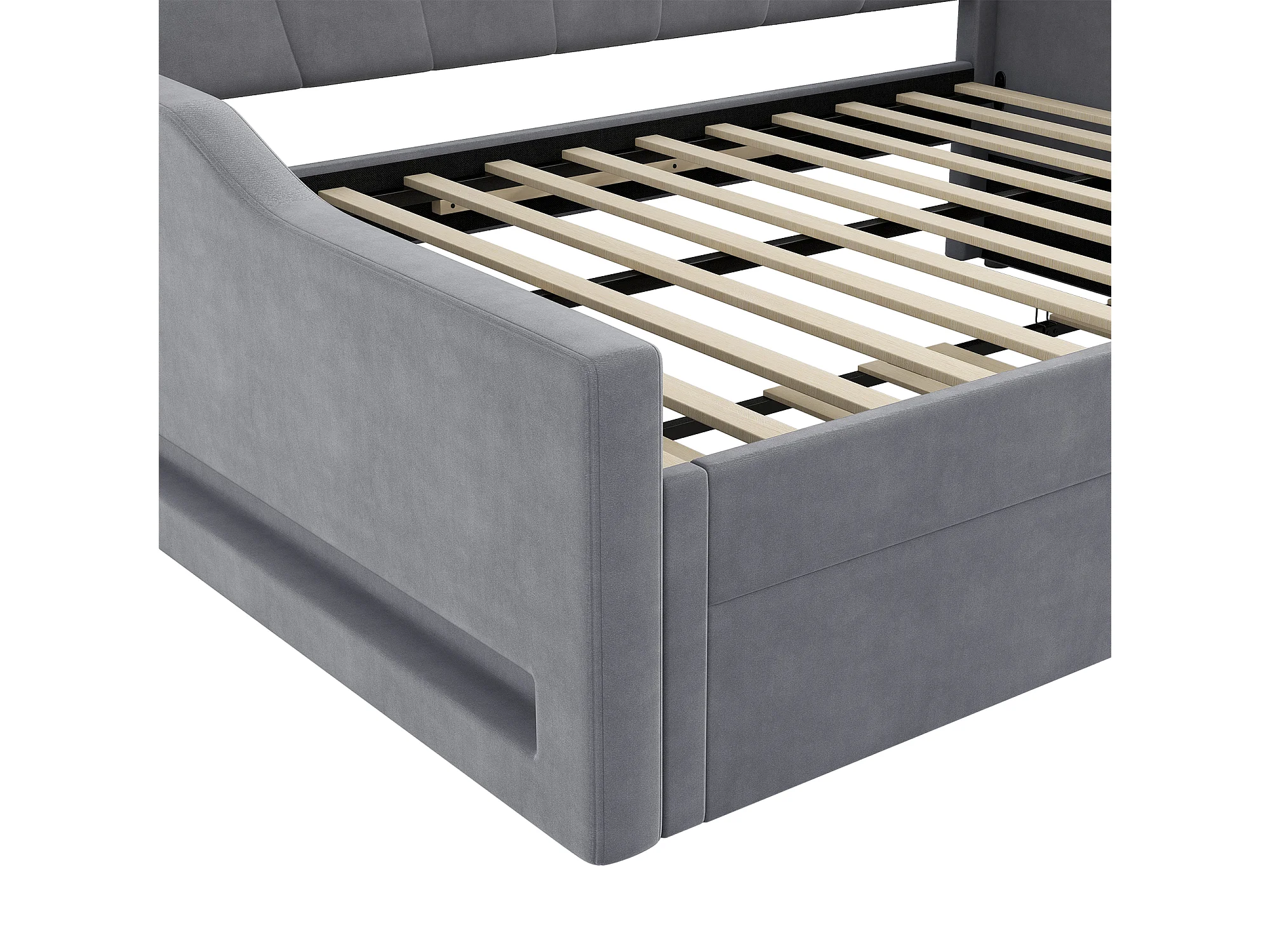 Lit de jour 140 x 200 cm avec ceinture LED et lit escamotable, en tissu gris, MDF et contreplaqué (212x148.5x84 cm)