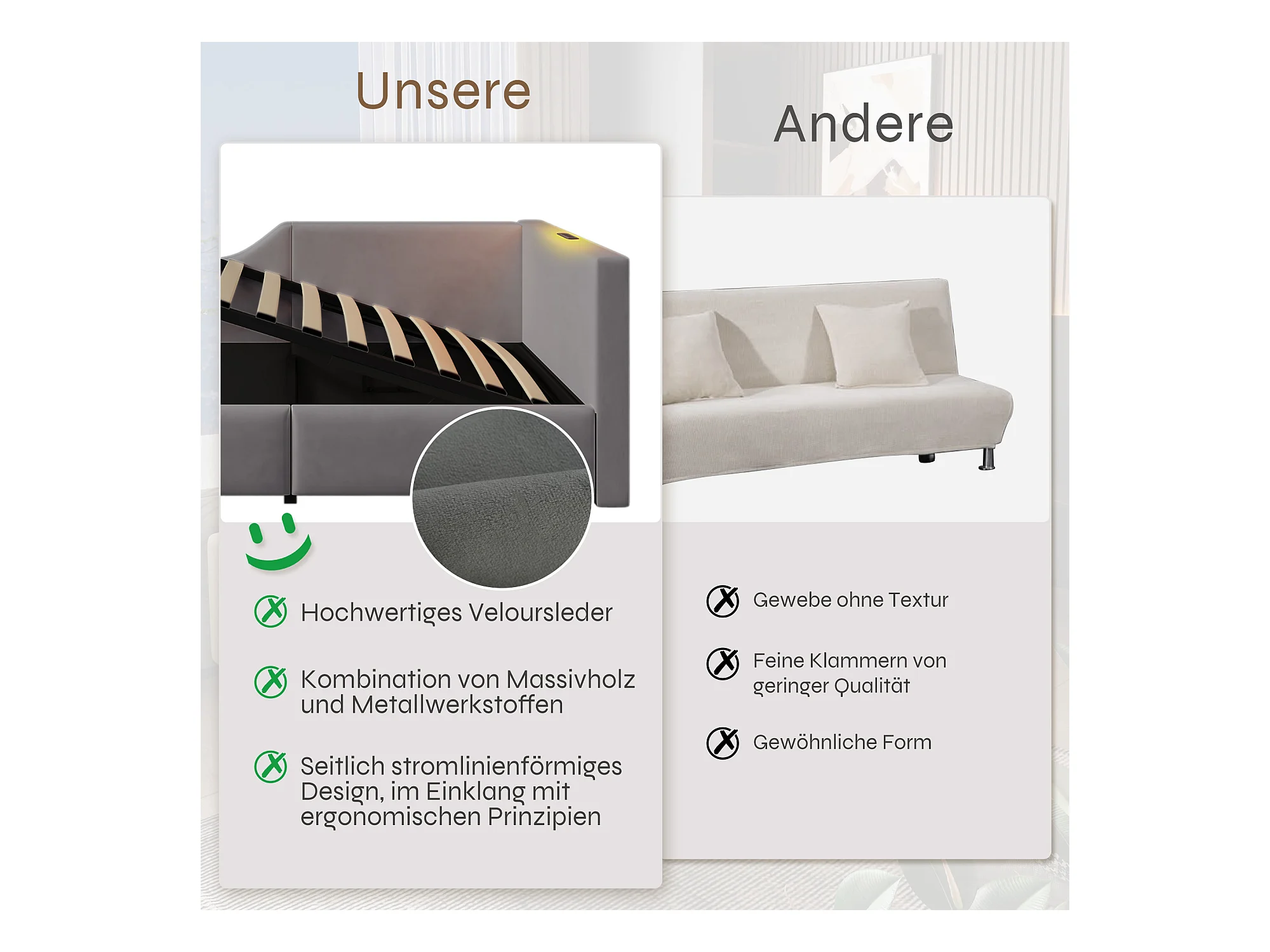 Lit banquette rembourré en velours 90x200cm + un lit gigogne 90x190cm - Gris