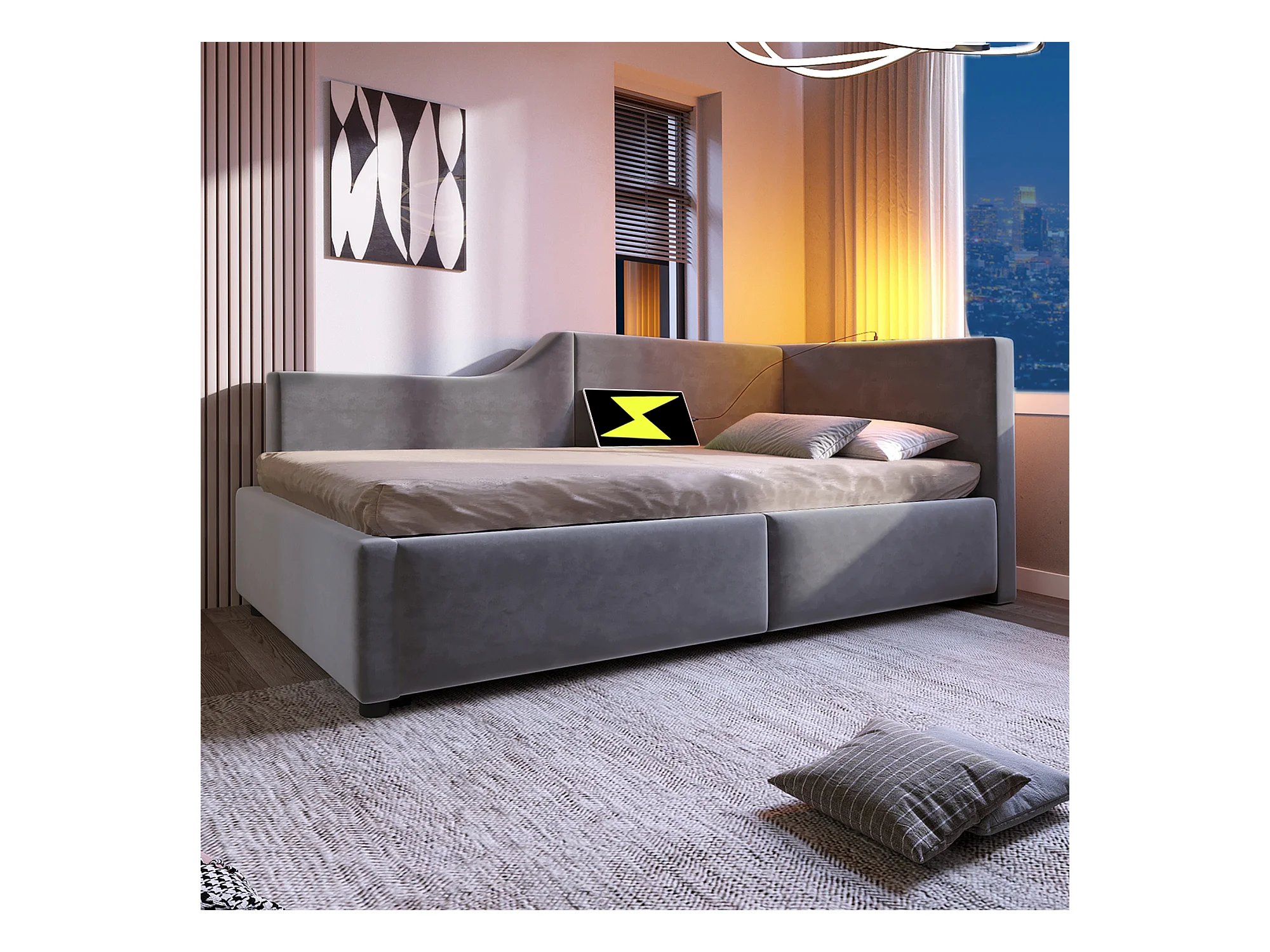 Lit de jour 90x200 cm avec rangement hydraulique, liseuse et port USB-C, cadre en velours gris, avec 4 tiroirs (203x98x70.5 cm)