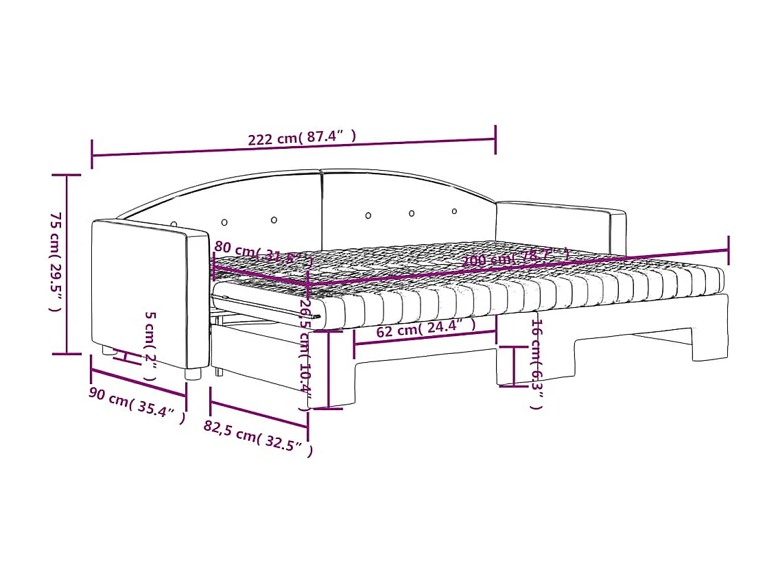 Lit de jour avec gigogne et matelas gris foncé 80x200cm velours