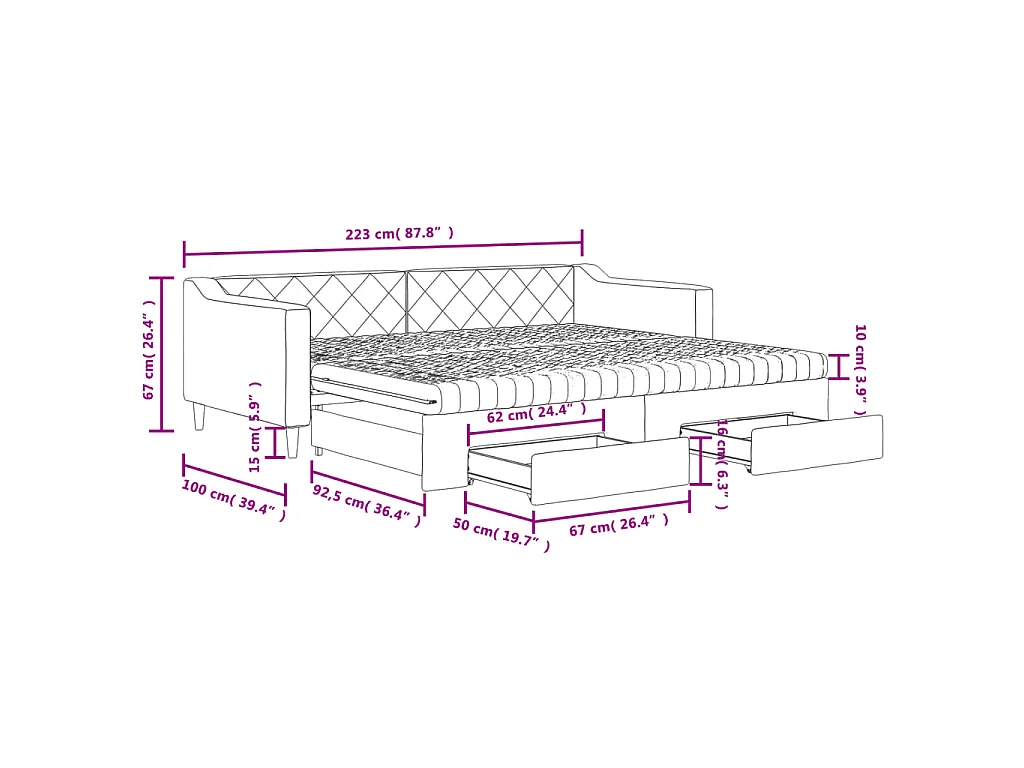 Lit de jour avec gigogne et tiroirs gris clair 90x200 cm tissu