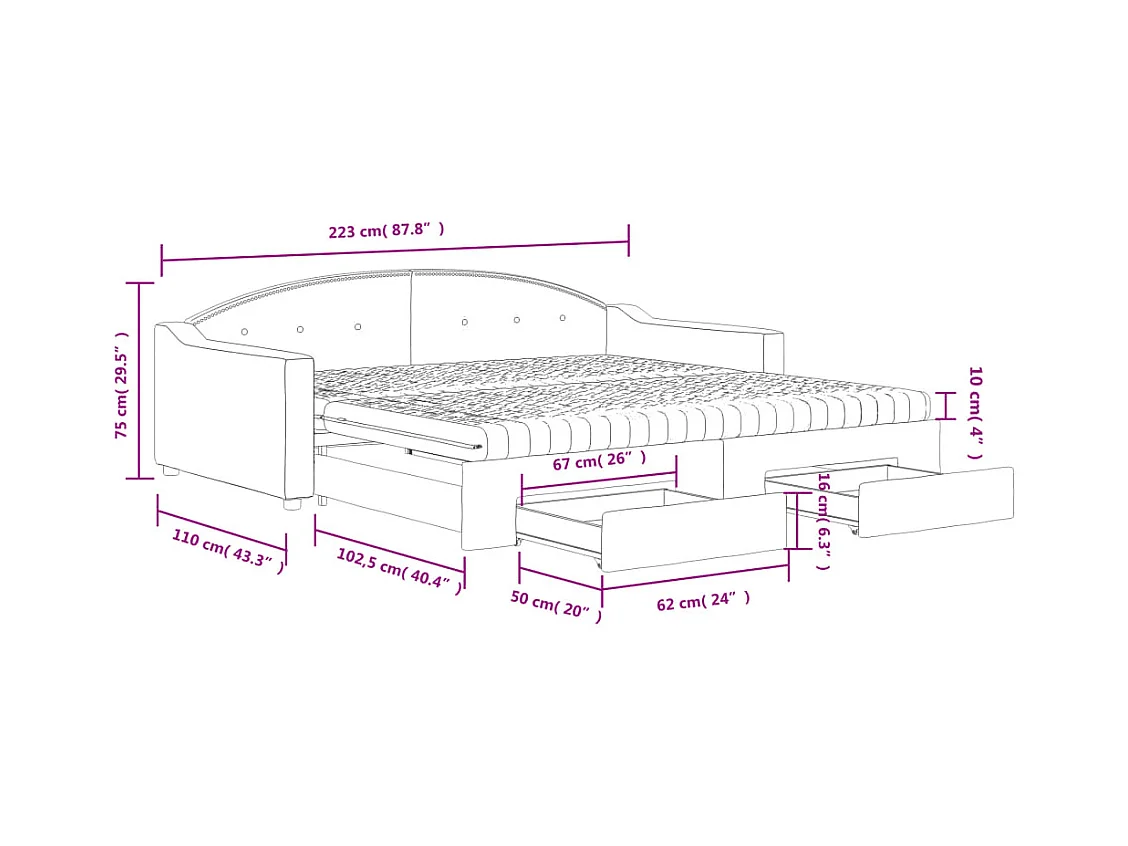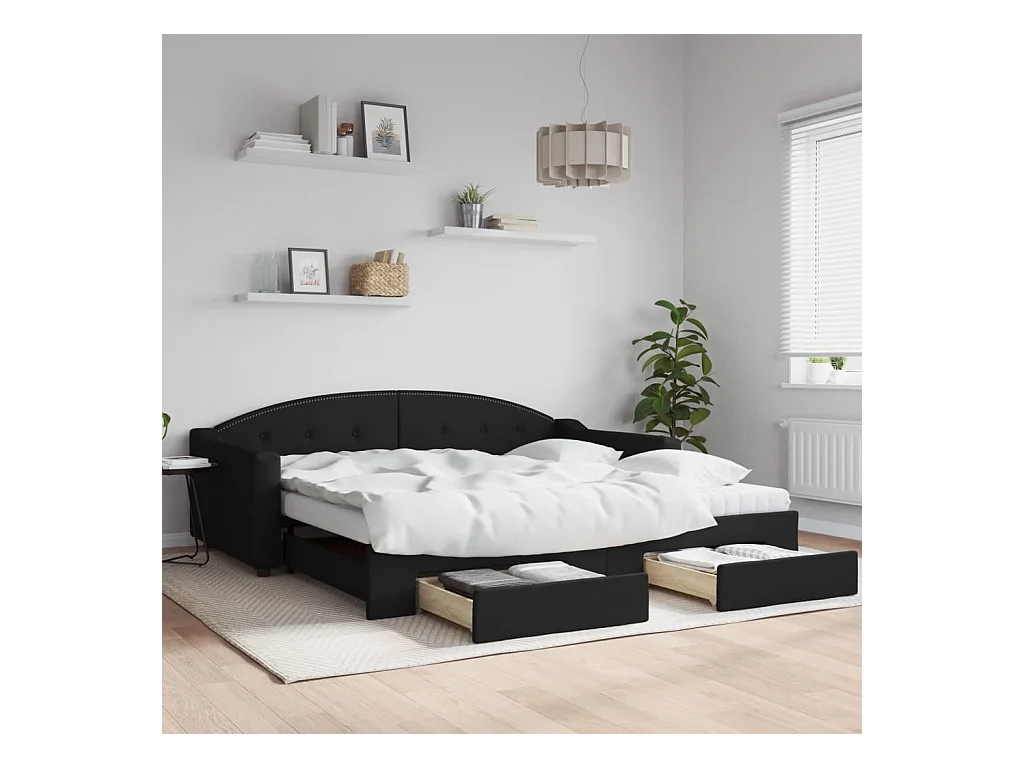 Lit de jour avec gigogne et tiroirs noir 100x200 cm tissu