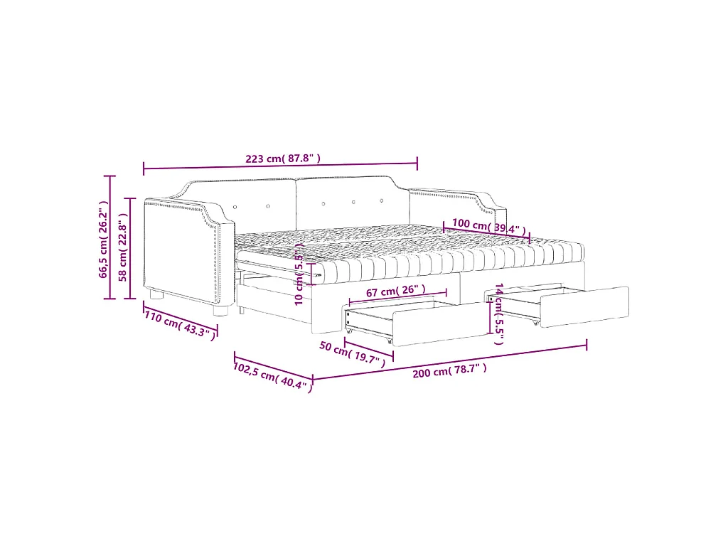 Lit de jour avec gigogne et tiroirs noir 100x200 cm tissu