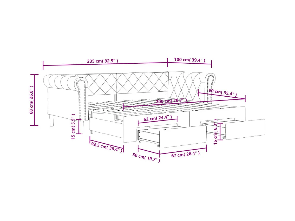 Lit plat 90x200 cm, lit rembourré avec tiroirs, tissu avec clous décoratifs, beige (203x90x111.5 cm)