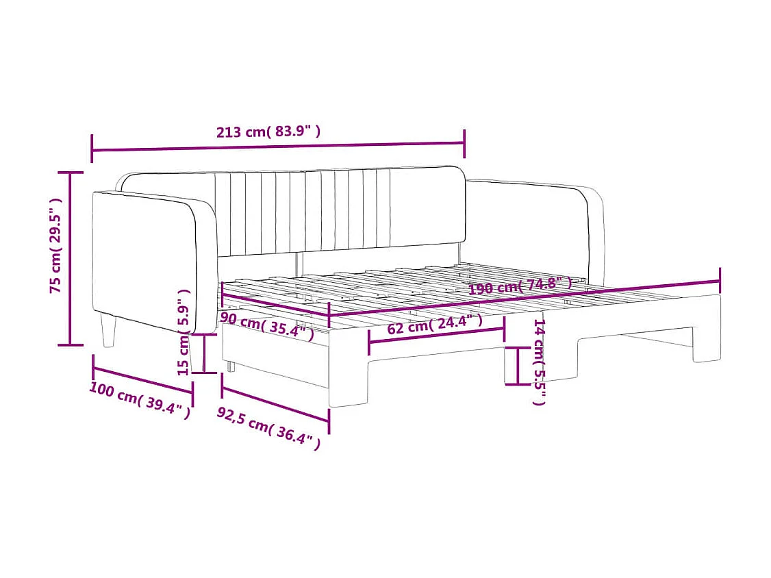 Lit de jour avec gigogne et matelas gris foncé 90x190cm velours