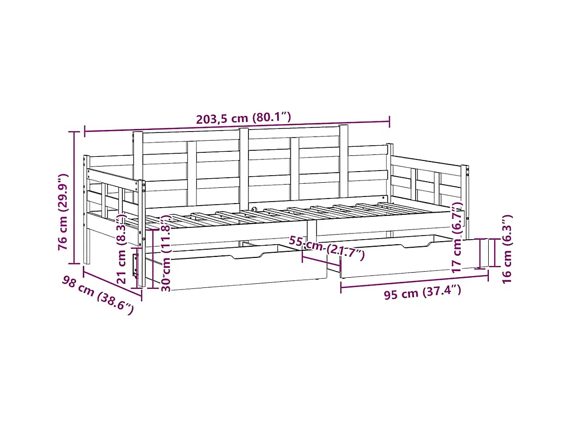 Lit de jour avec tiroirs sans matelas 90x200 cm bois massif