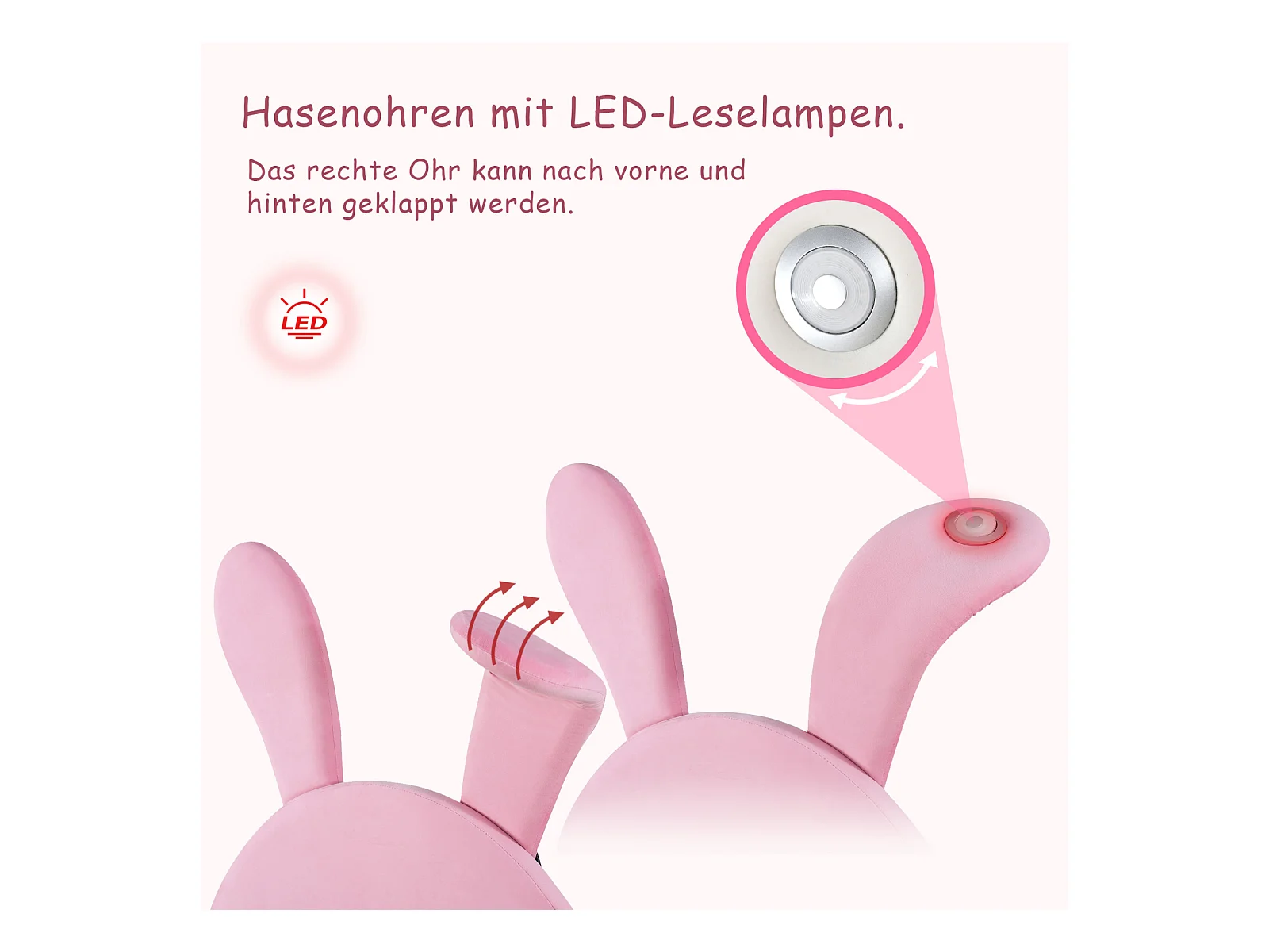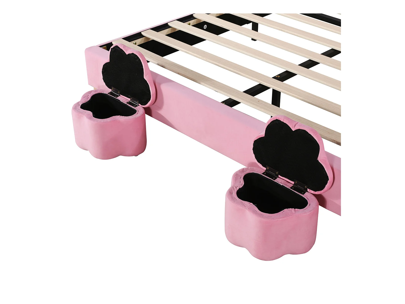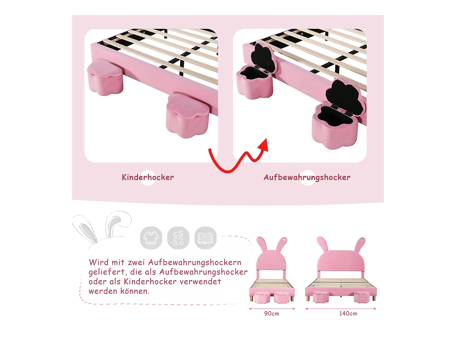 Lit d'enfant 140x200cm, avec 2 tabourets, avec sommier à lattes et tête de lit oreilles de lapin avec un lampe, sans matelas, velours, Rose