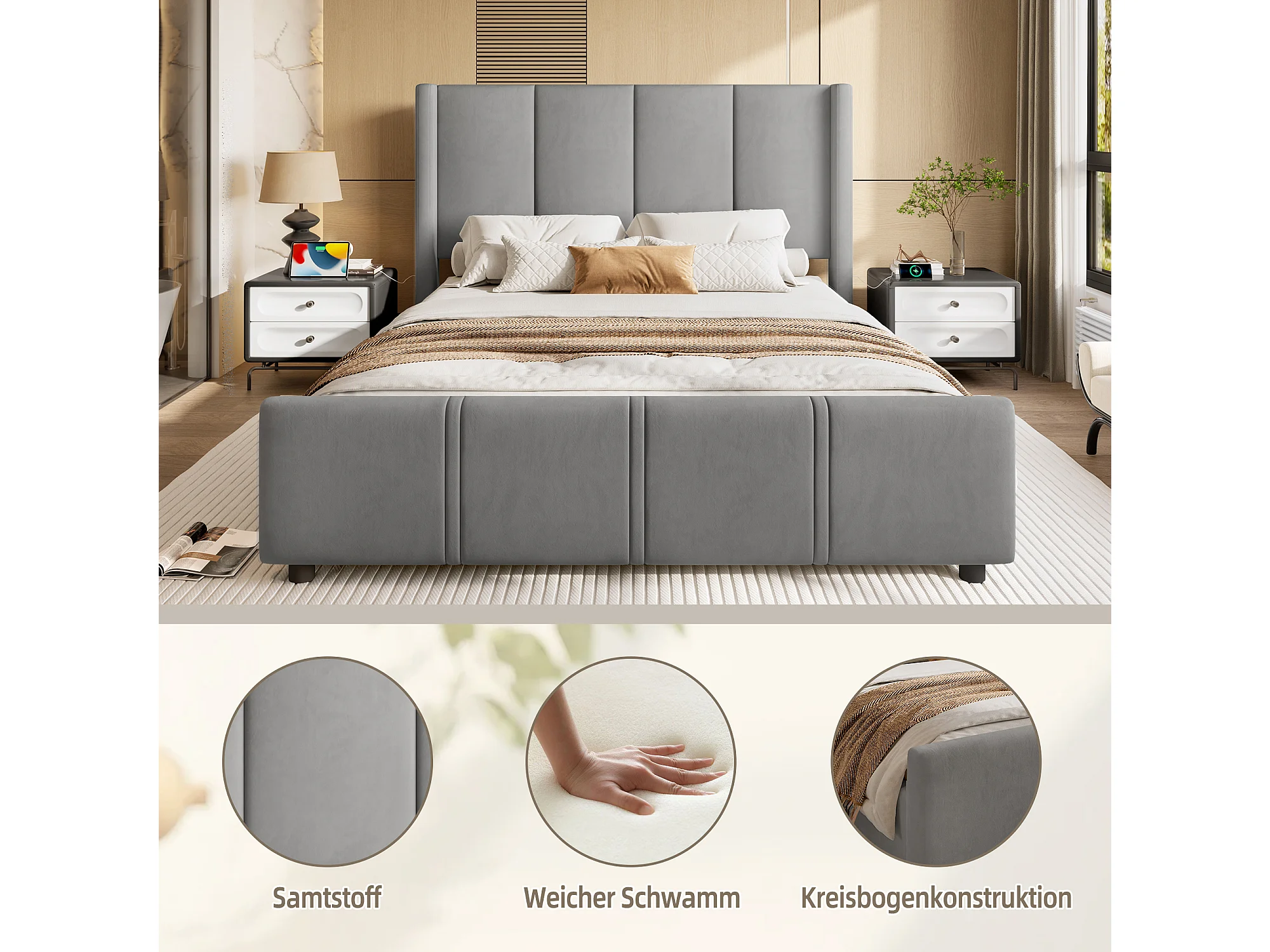 Lit Coffre Rembourré 140×200 Cm Velours Gris– Grand Tête De Lit - avec LED – Ports USB/USB‑C – Style Contemporain