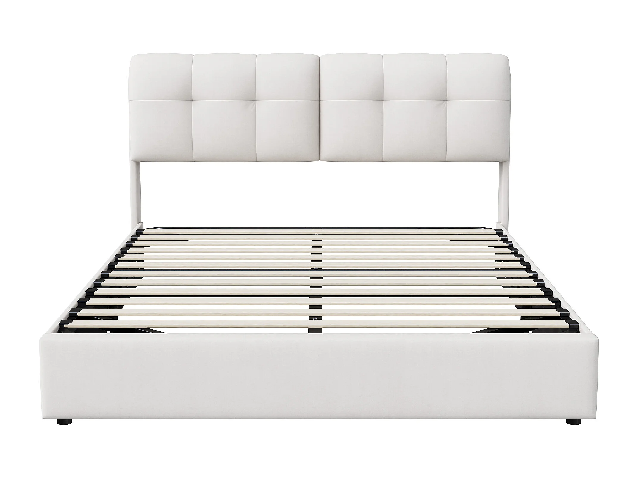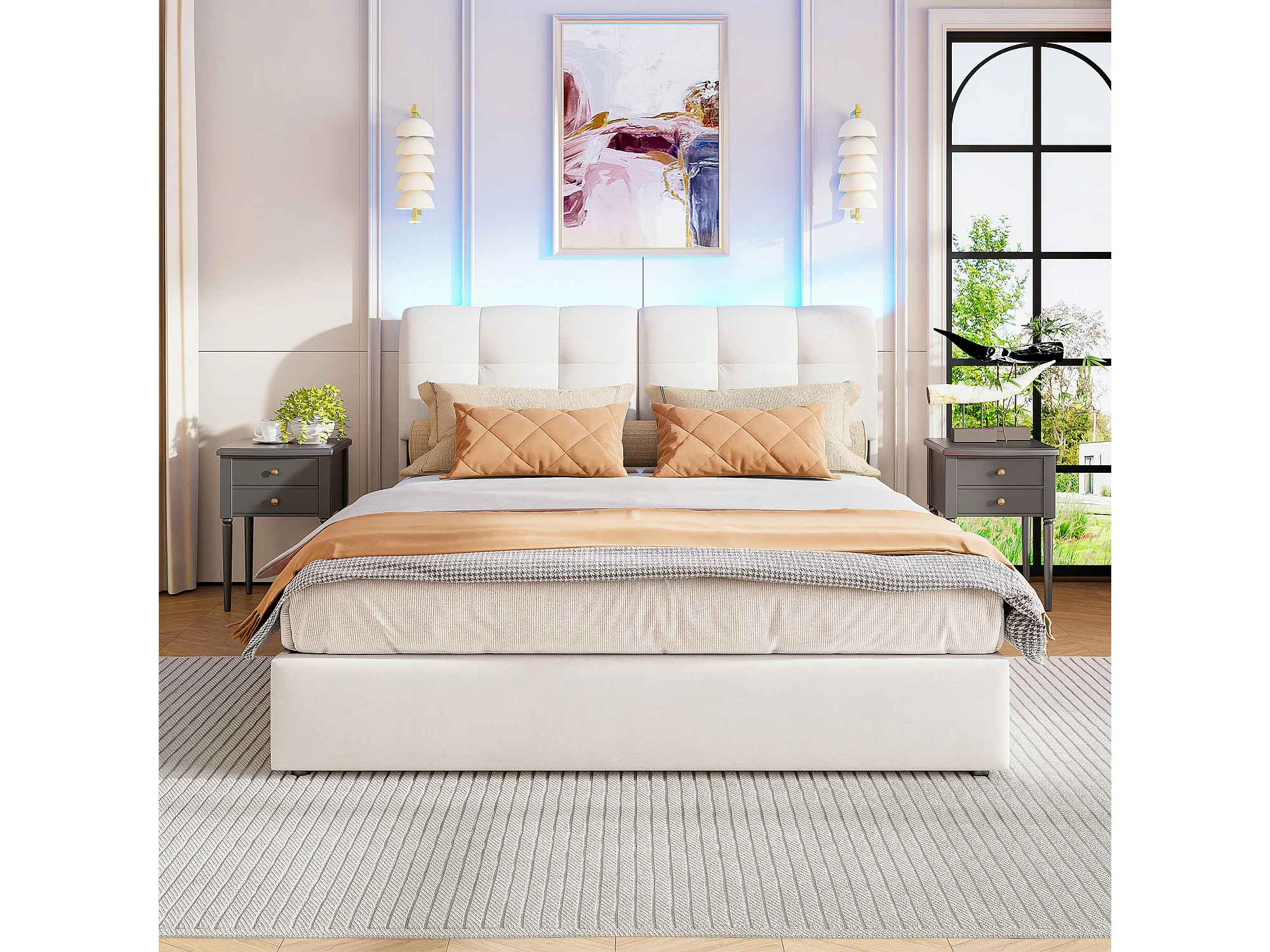 Lit double 140 x 200 cm, LED avec rangement et chargeur, lits tapissés avec espace de rangement, tête de lit en velours, sans matelas, beige