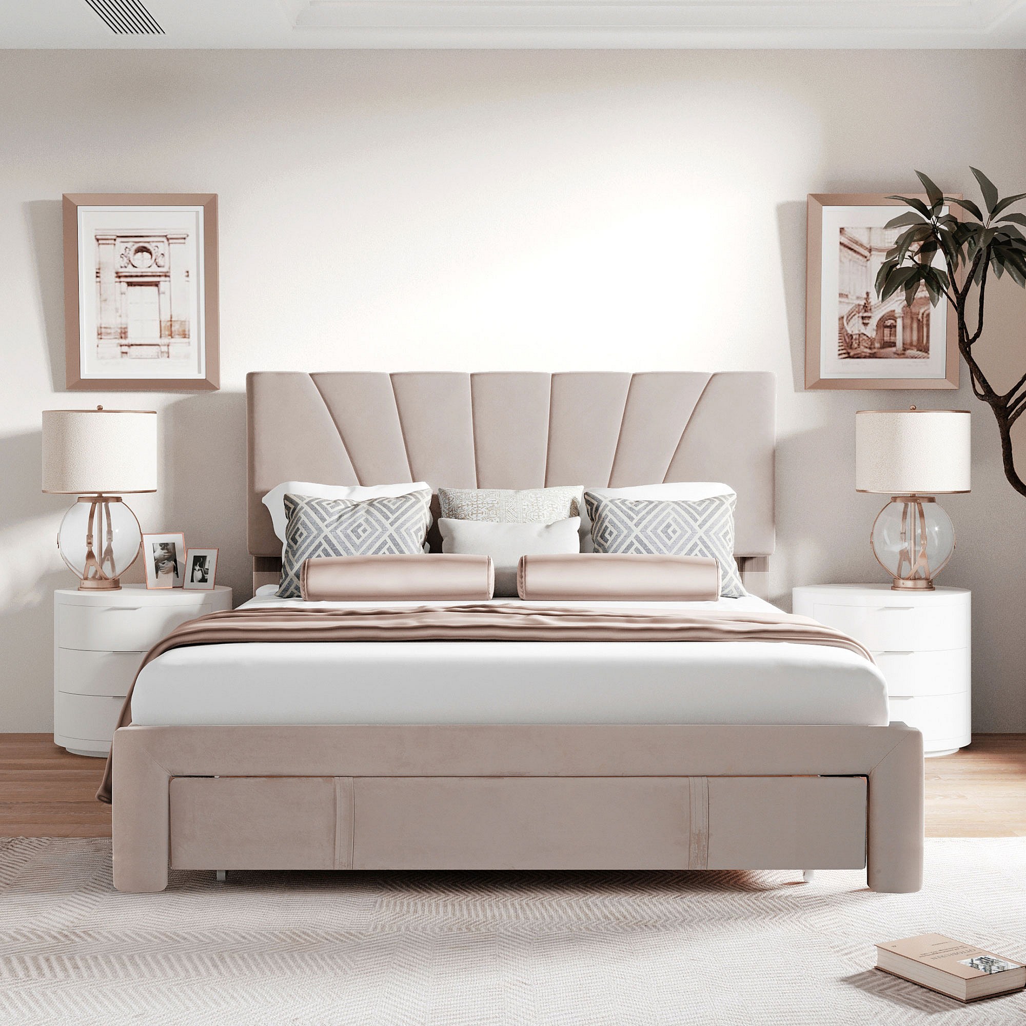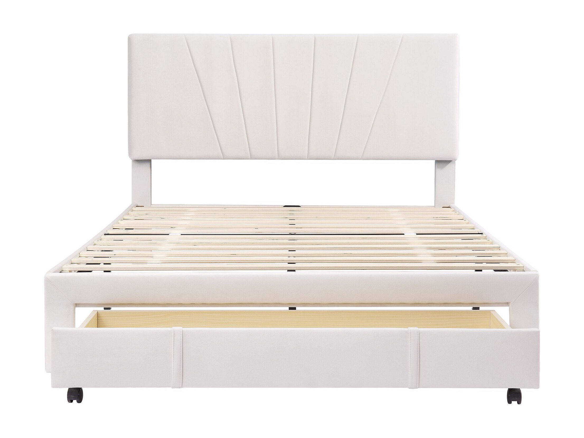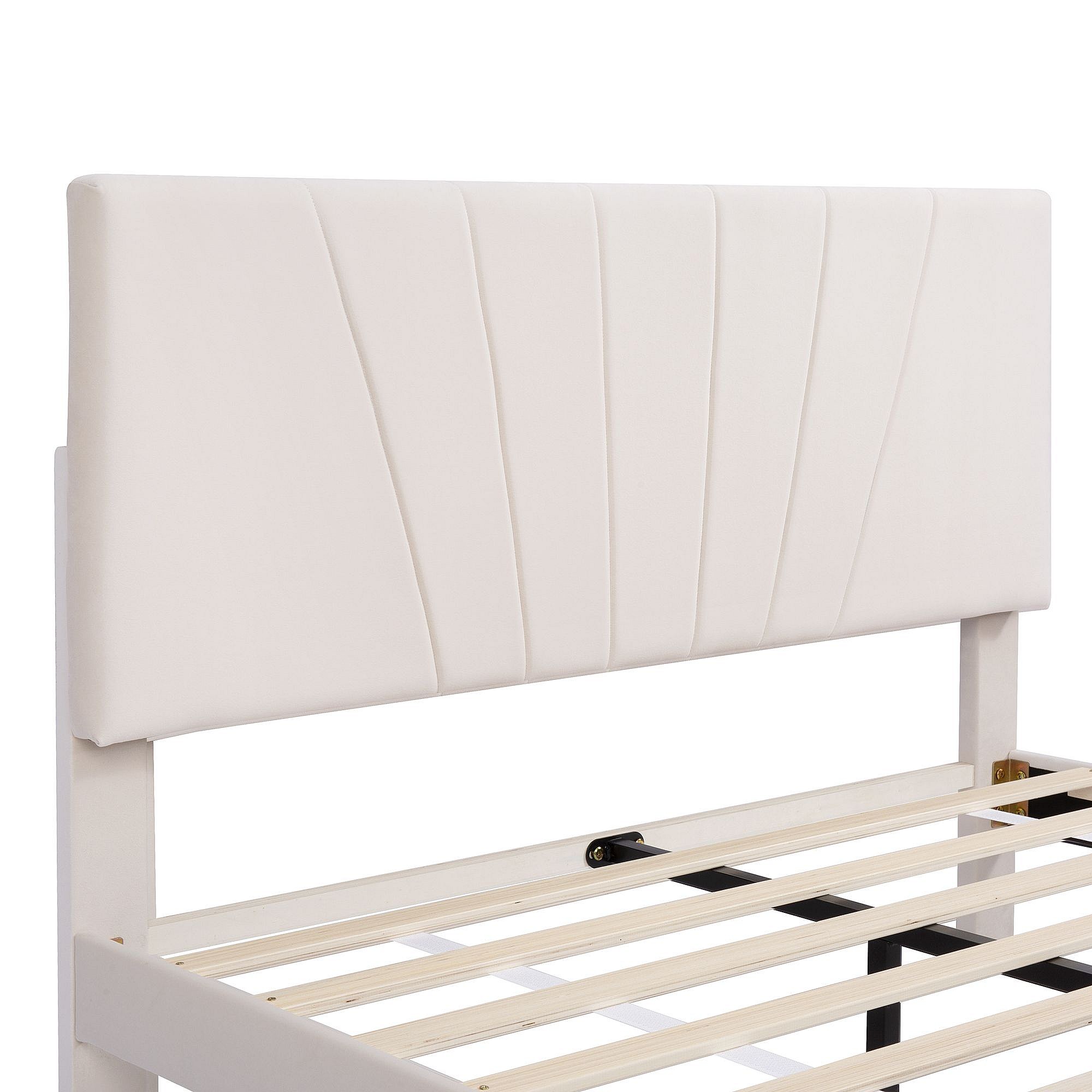 Lit double 140 x 200 cm - Lit adulte avec 1 grand tiroir et 4 tiroirs gigognes - velours beige - matelas non inclus