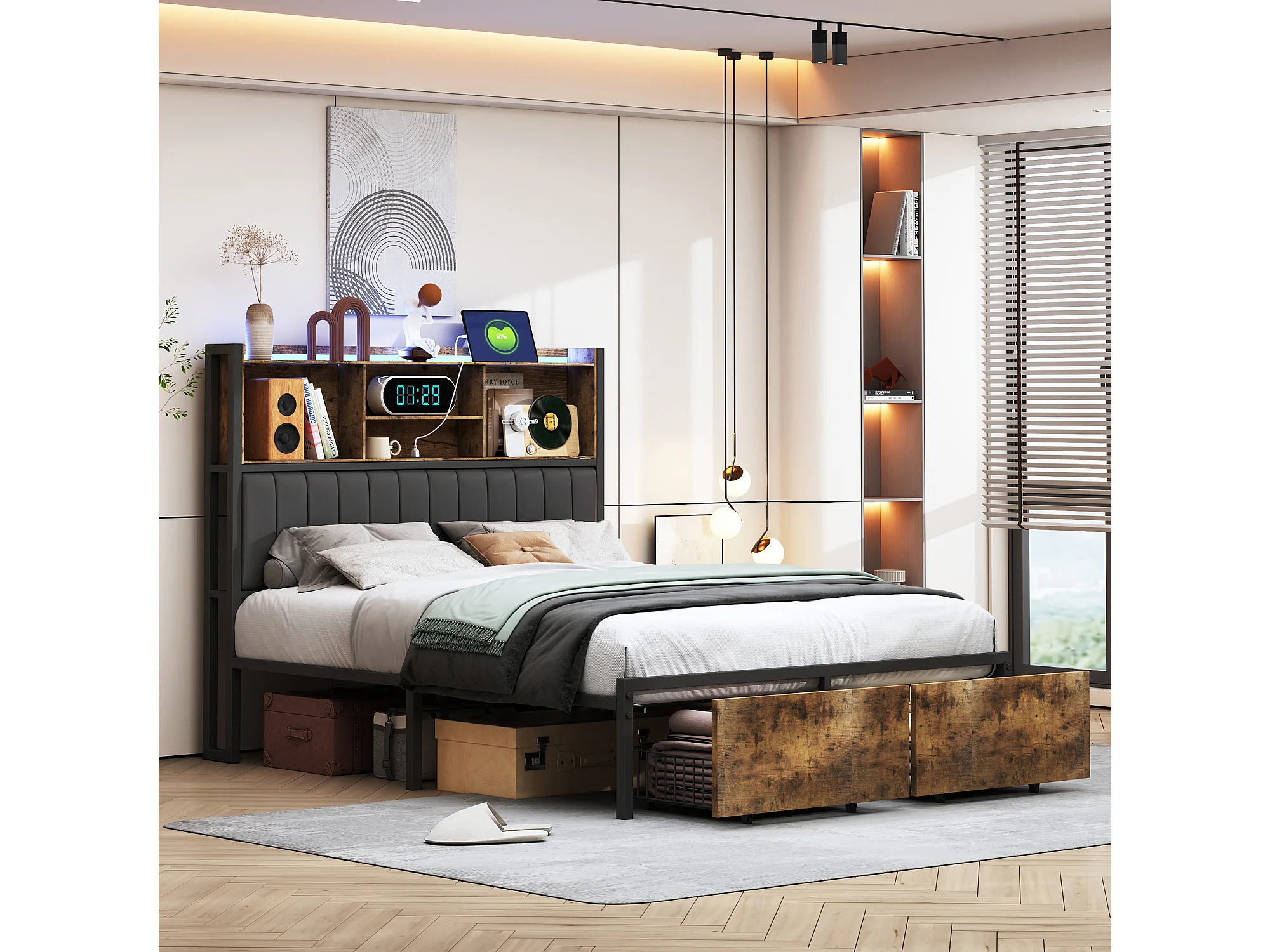Lit double 140x200 cm en métal et bois avec tête de lit rembourrée PU, éclairage LED RGB, station de charge USB/Type-C et 2 tiroirs de rangement
