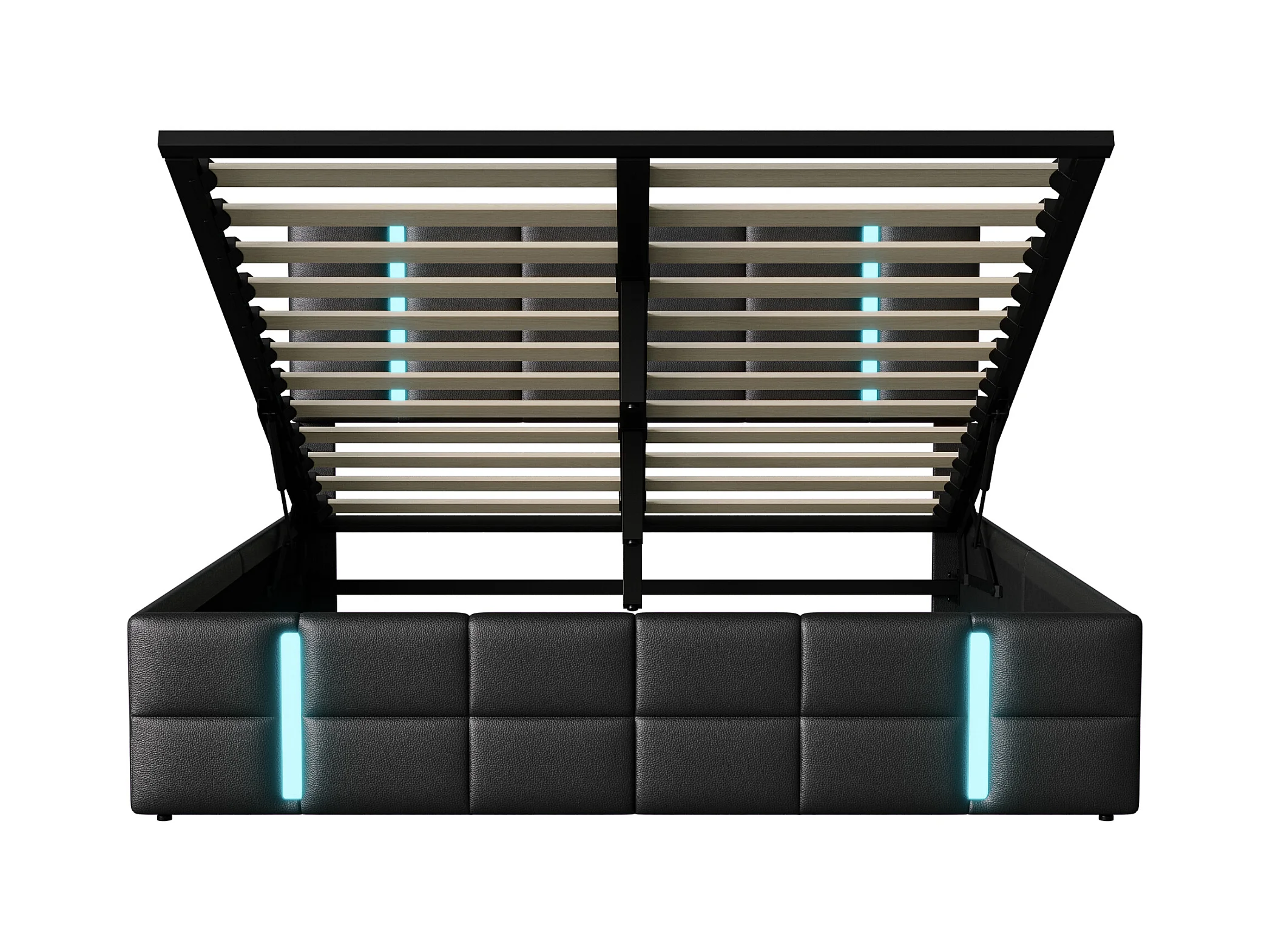 Lit coffre double 140x200 cm avec sommier à lattes, tête de lit capitonnée PU, 2 tiroirs, éclairage LED et cadre métallique robuste.