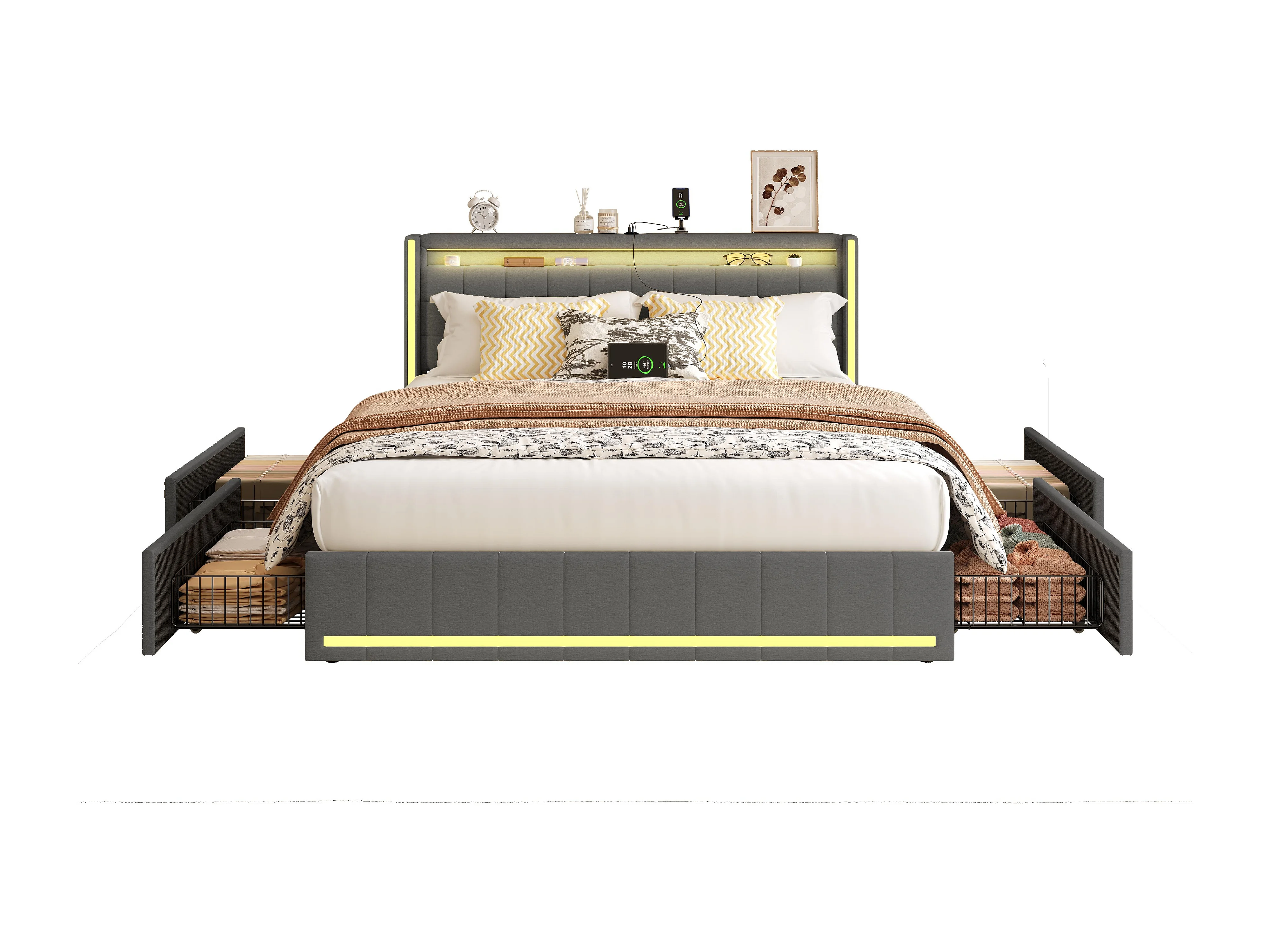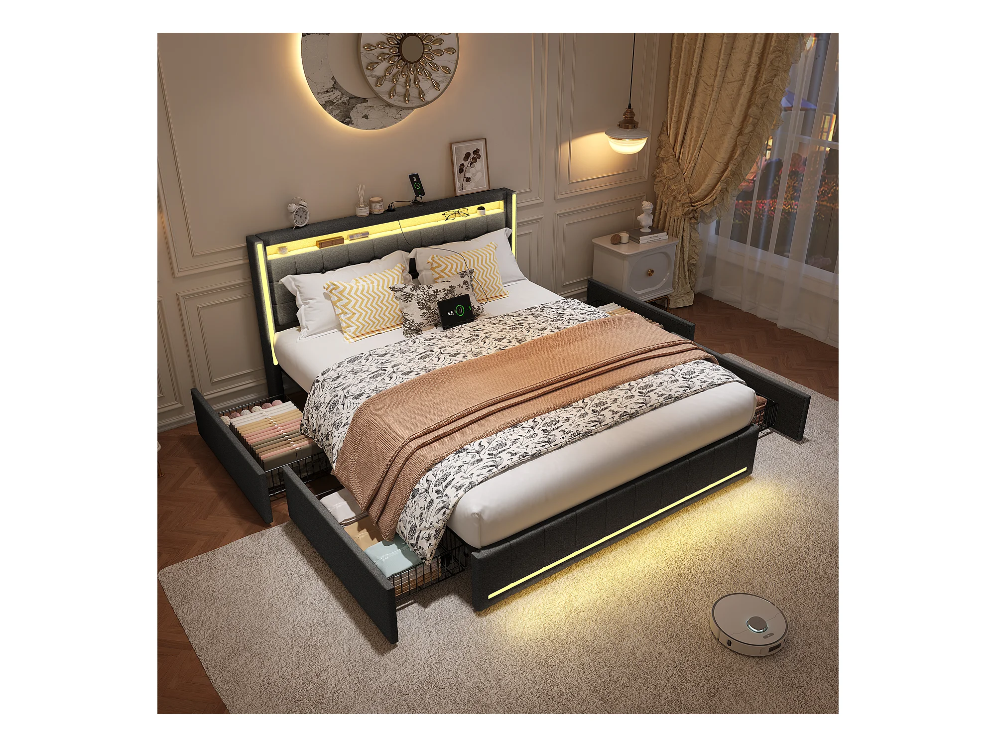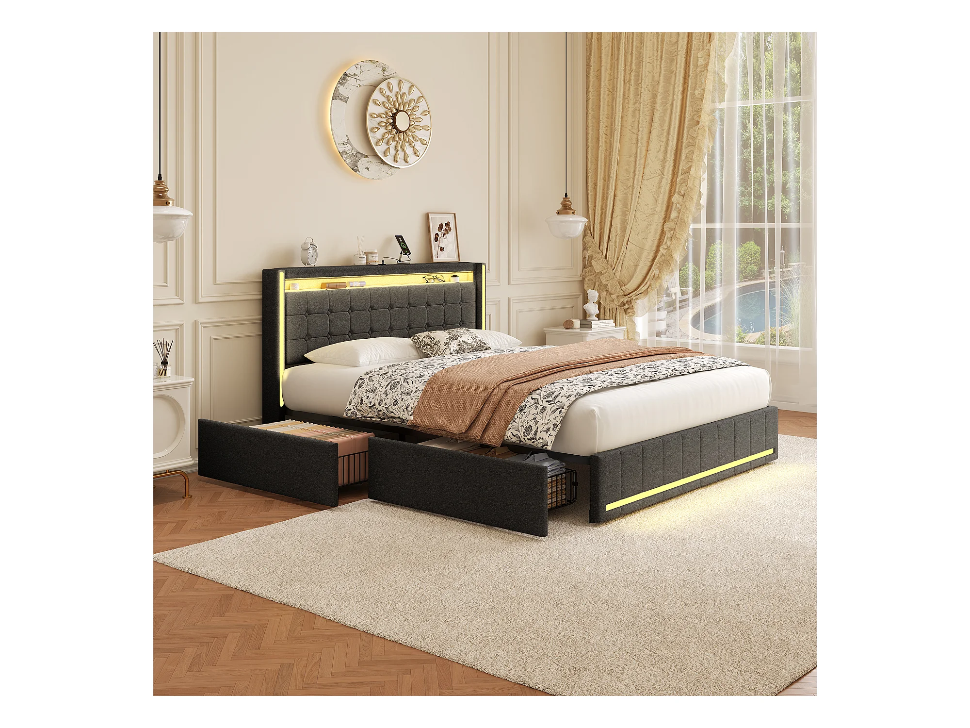 Lit double 140x200 cm en tissu lin gris avec LED intégrées, tête et pied de lit lumineux, 4 tiroirs de rangement, ports USB & Type-C