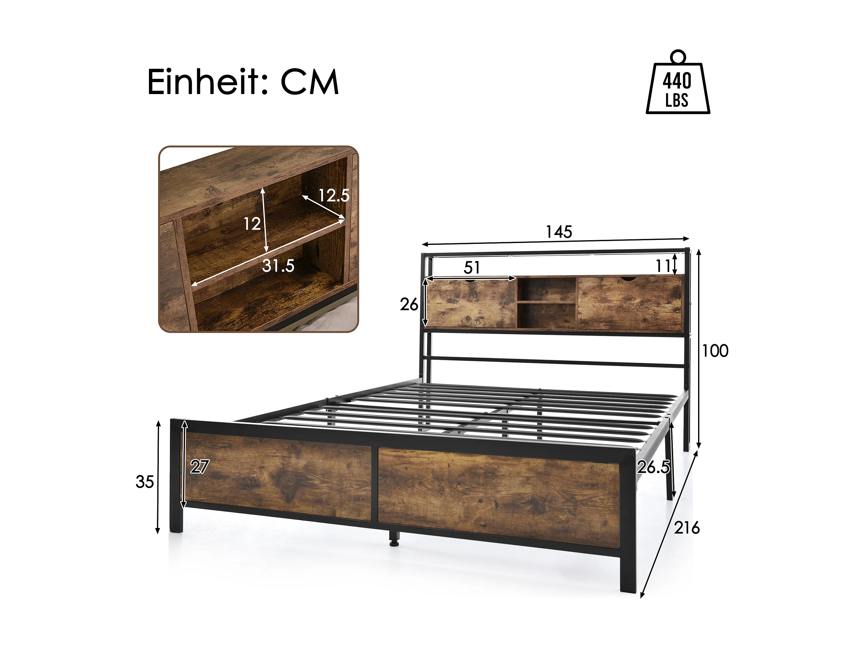 Lit double 140x200 cm - Lit ado avec tête de lit coffre et sommier à lattes métalliques - naturel