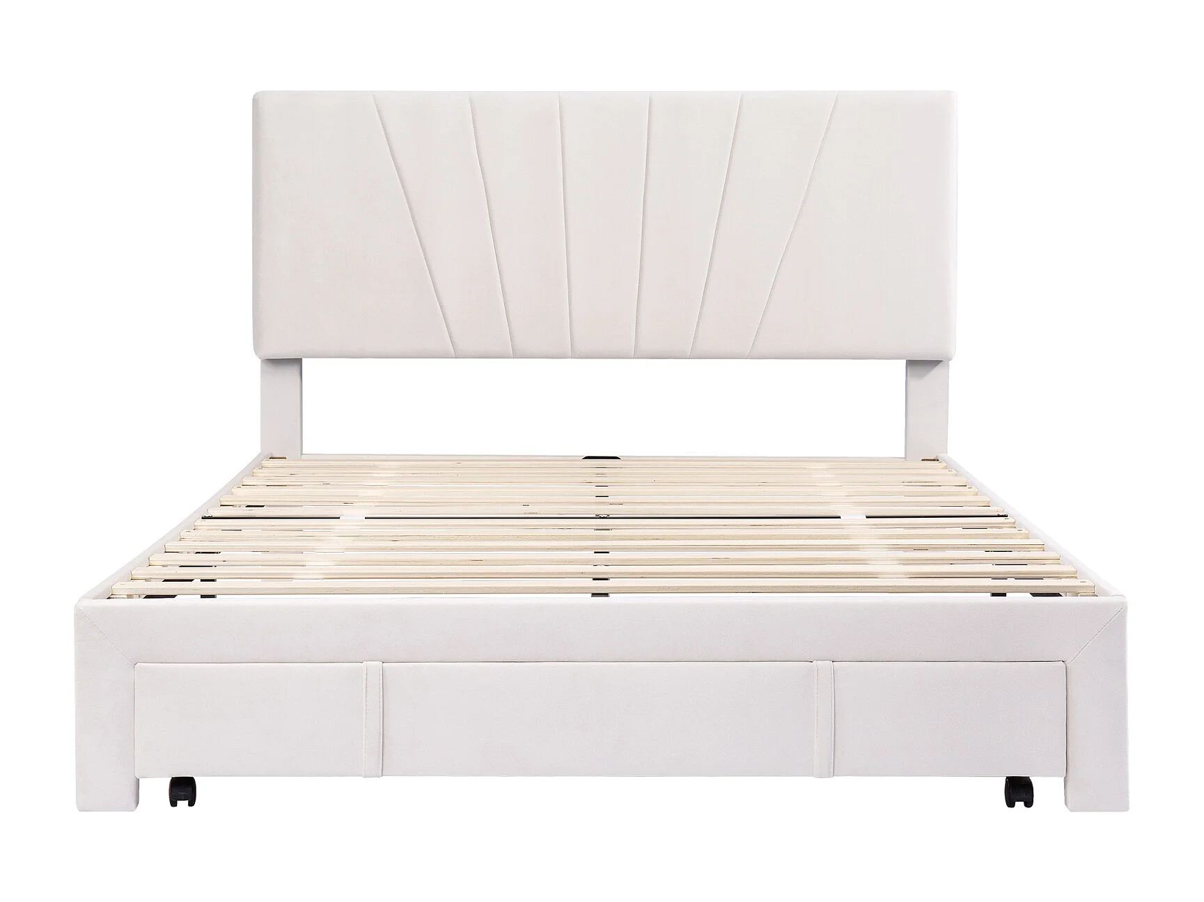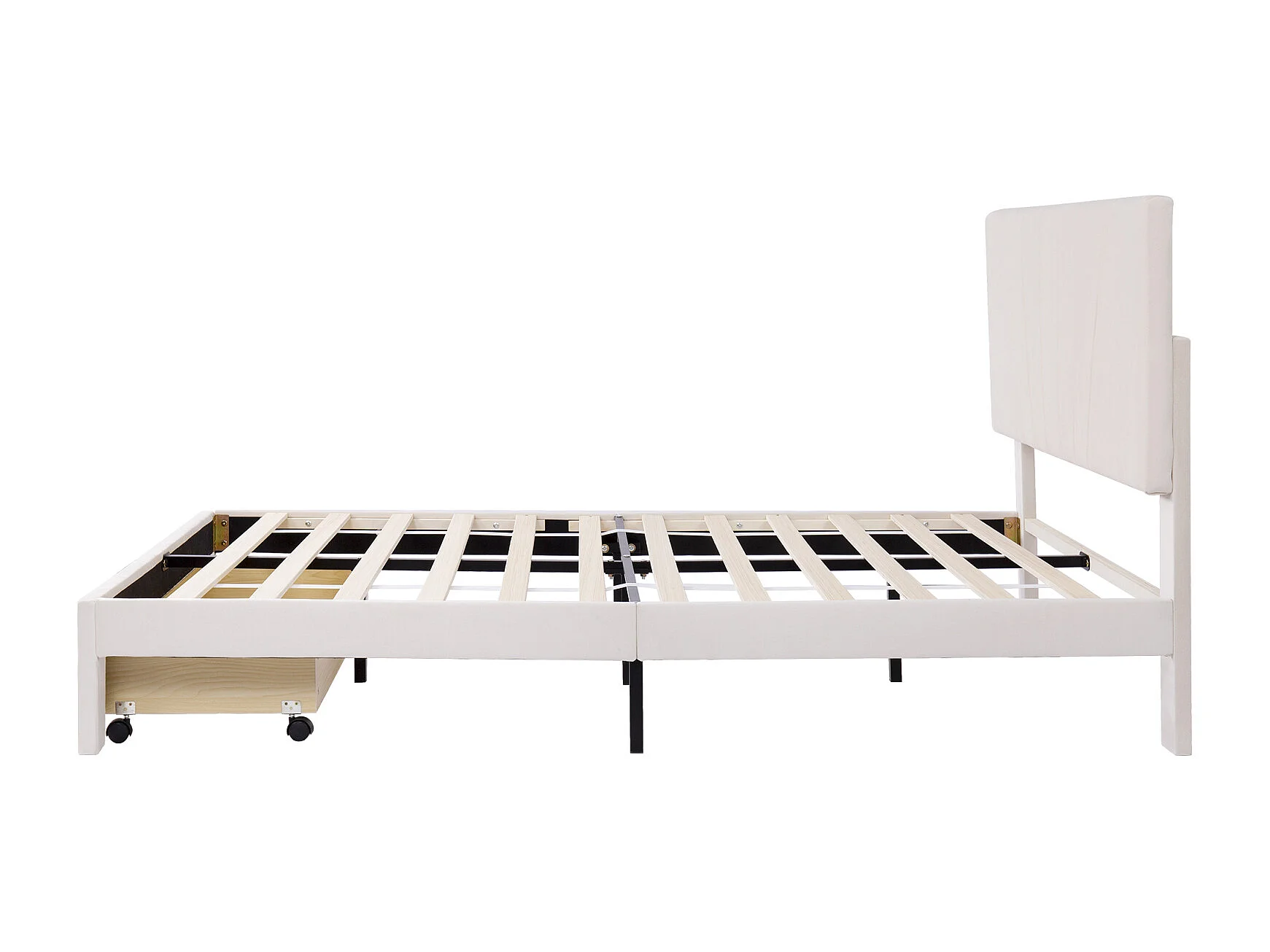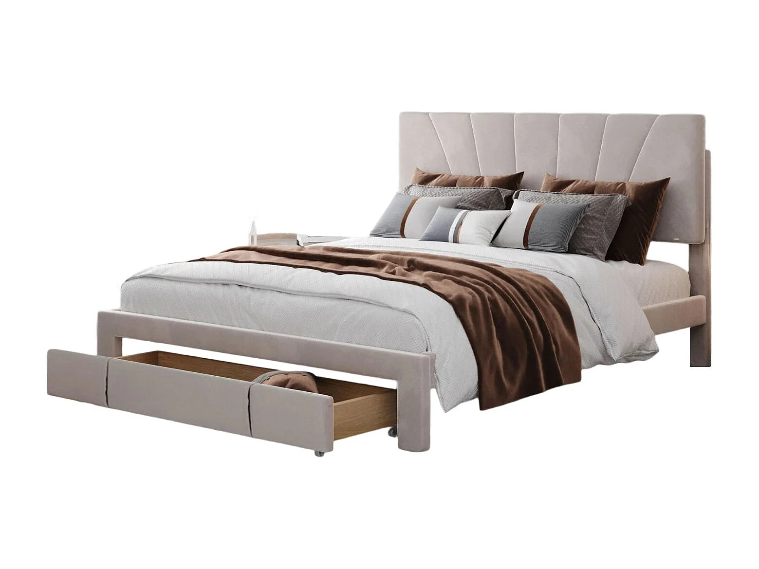 Lit Double 140x200 Cm, Rembourré Avec Tiroir De Rangement, Sommier à Lattes En Bois, Beige