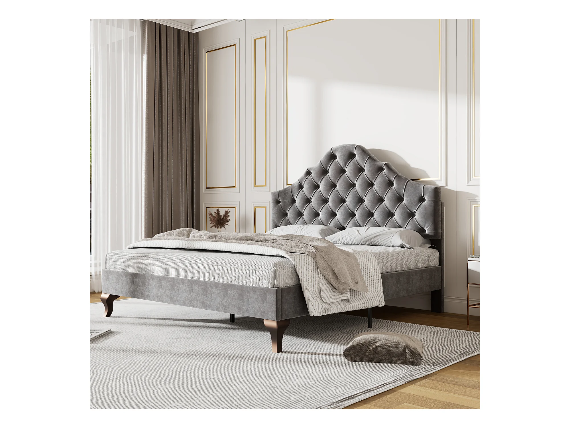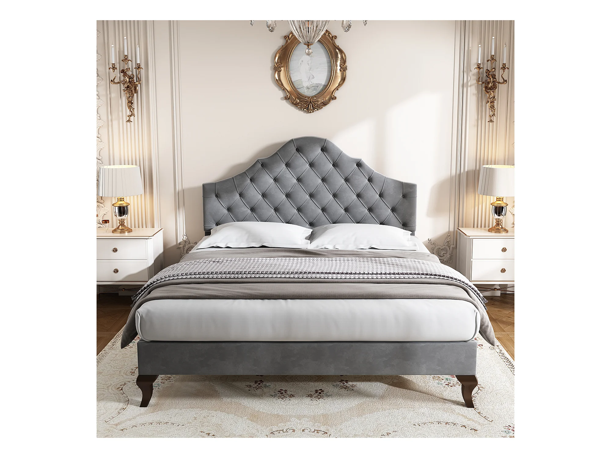 Lit adulte 140x200 cm - Tête de lit réglable - Sommier à lattes en bois - Velours gris (sans matelas)