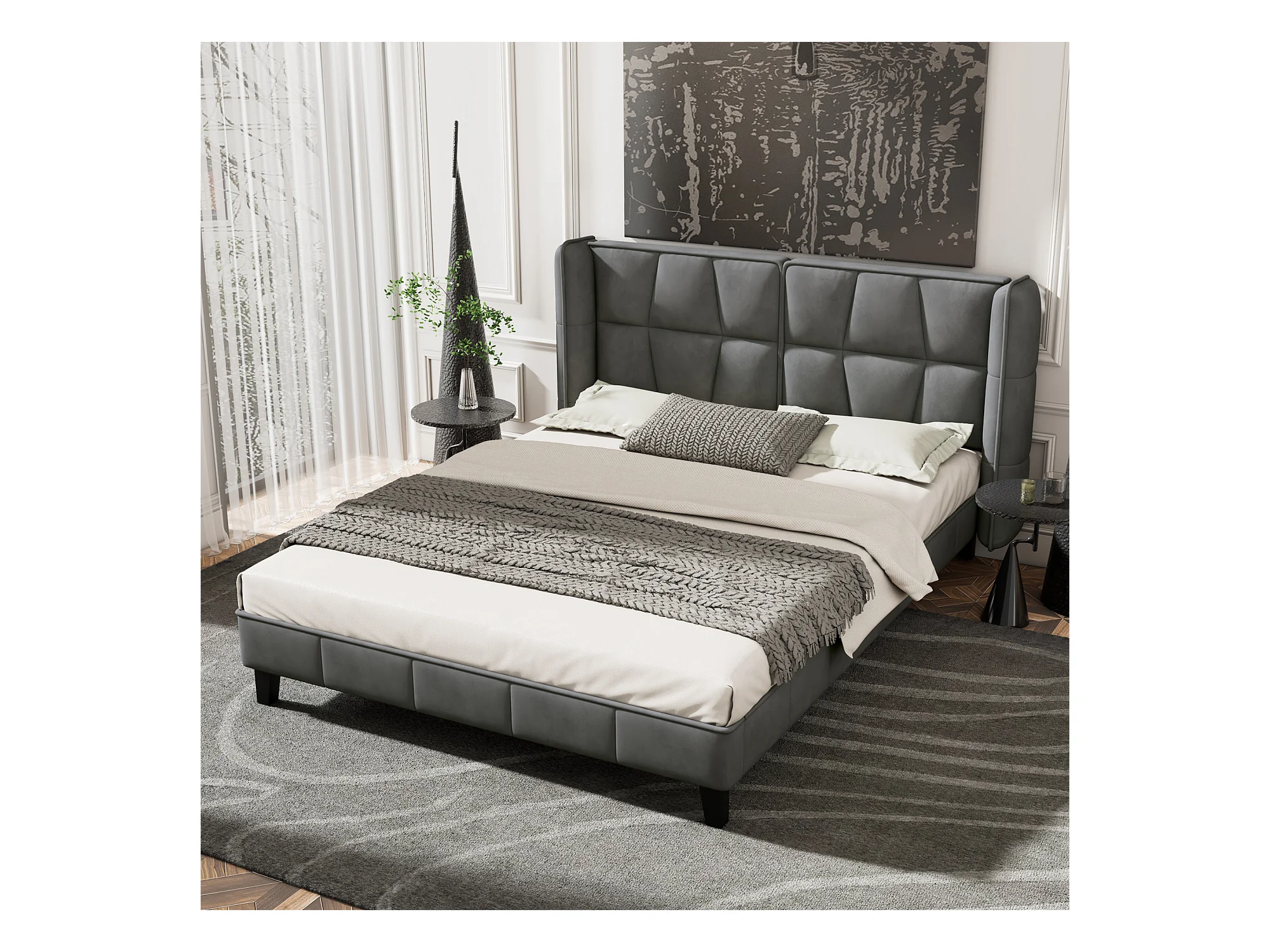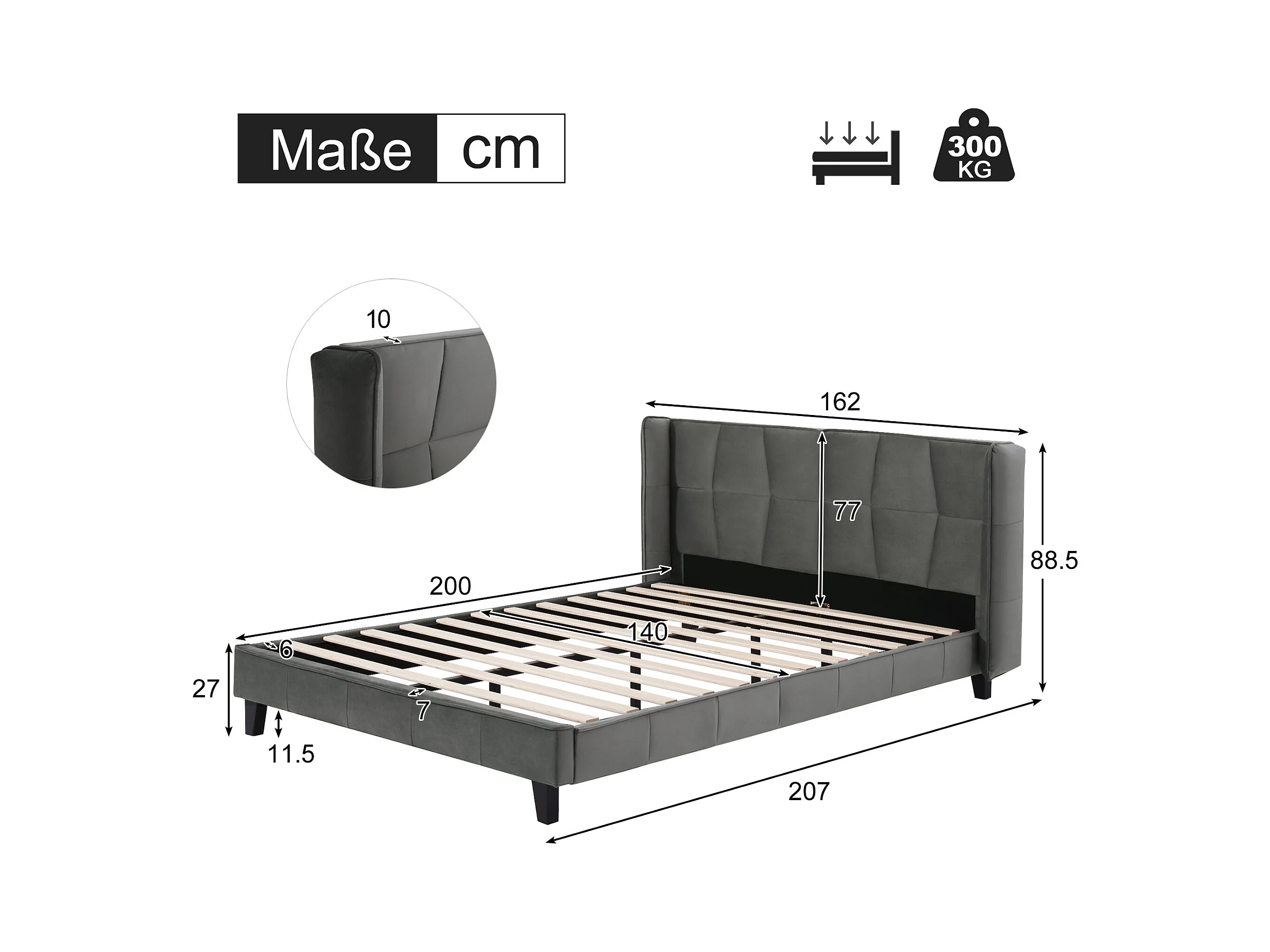 Lit adulte 140x200 cm en velours gris - avec tête de lit, sommier à lattes(sans mattelas)