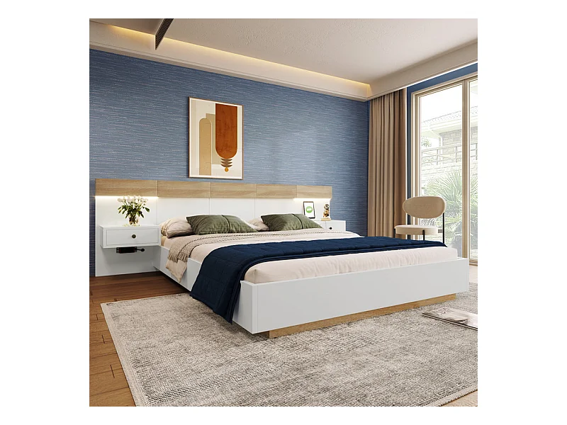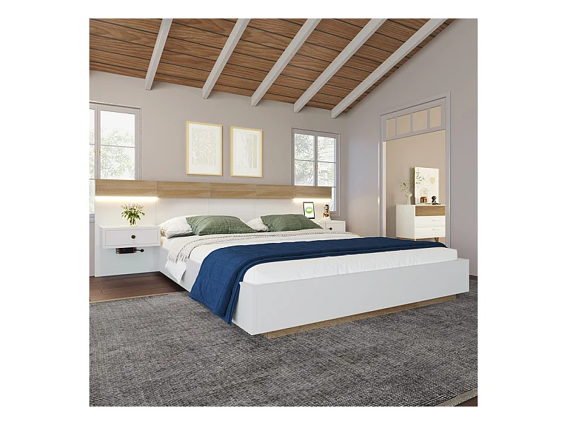 Lit 140x200 cm, 2 Tables de Nuit, 4 Tiroirs, Tête de Lit avec Lampe et USB, Bois Massif et MDF, Blanc + Chêne Clair (215x80x207 cm)