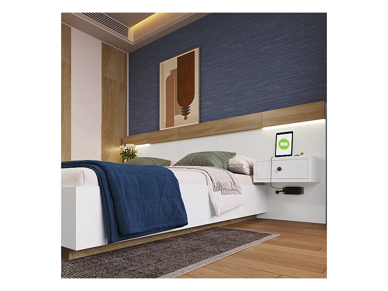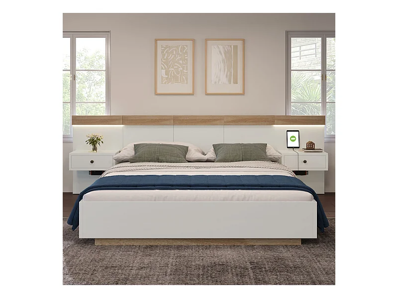 Lit double 140x200cm avec chevets + LED + Port de charge USB + Type-C + Prise EU, Blanc et Chêne