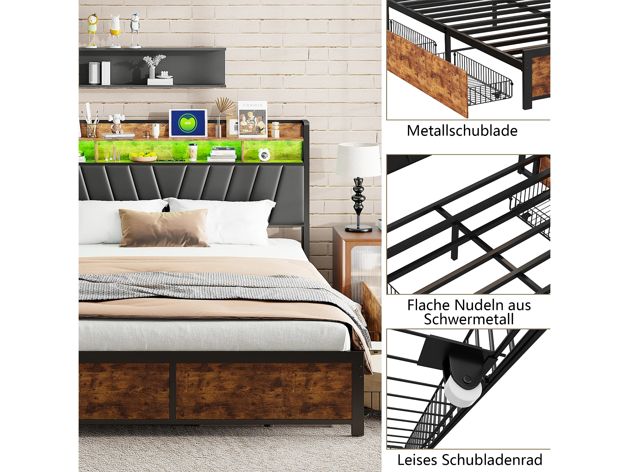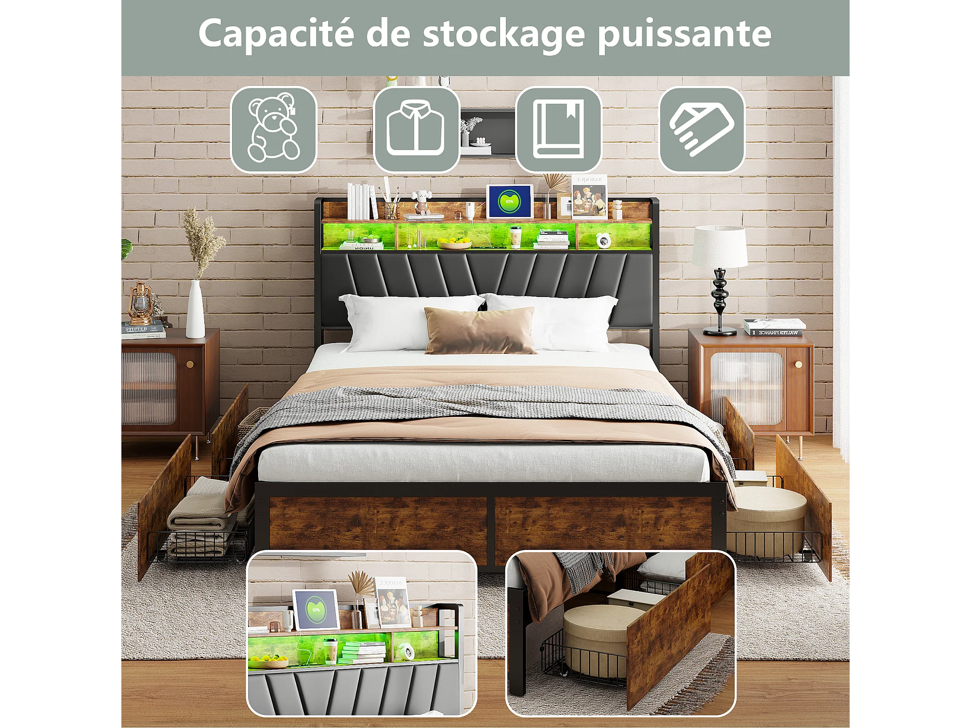 Lit double 140x200cm - avec sommier à lattes en métal et tête de lit LED de rangement - style industriel - lit en PU noir