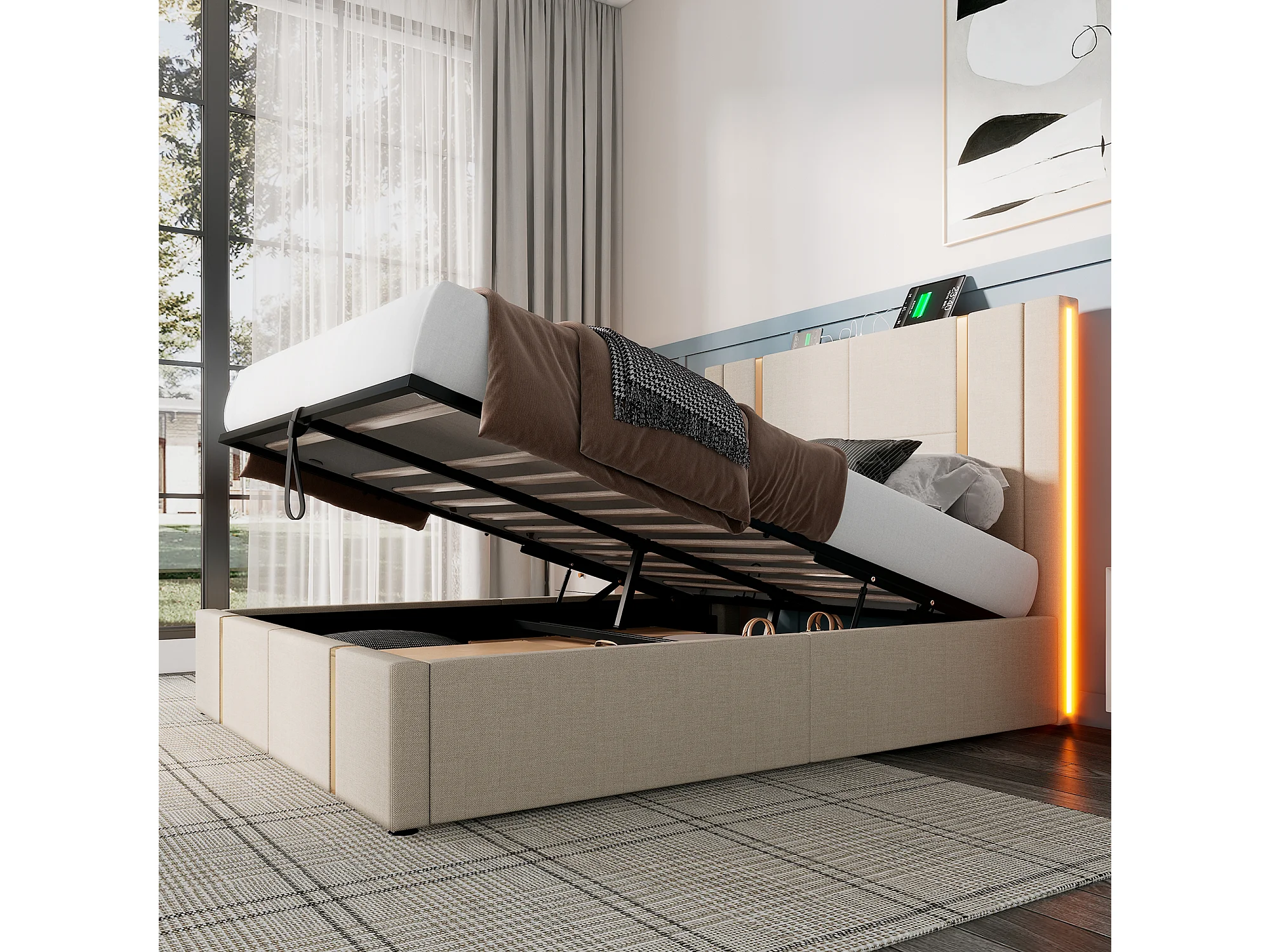 Lit double 160\200 cm, beige lin, avec rangement hydraulique, tête de lit USB Type-C et LED contrôlable par APP (sans matelas)