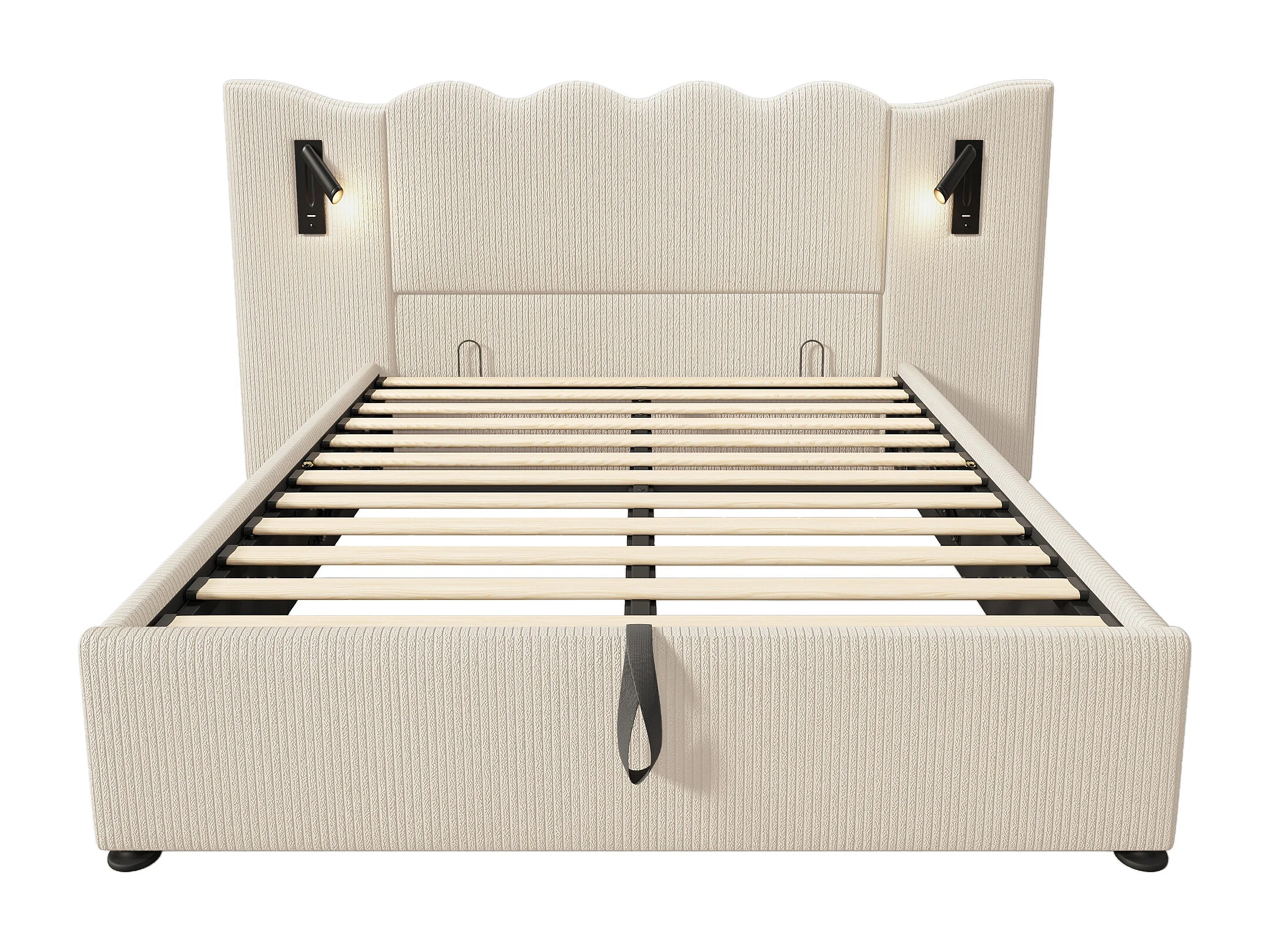 Lit double 160x200 avec lampe de lecture et chargeur USB Type-C, cadre en corduroy beige-blanc, bois massif et métal (215x232x111 cm)