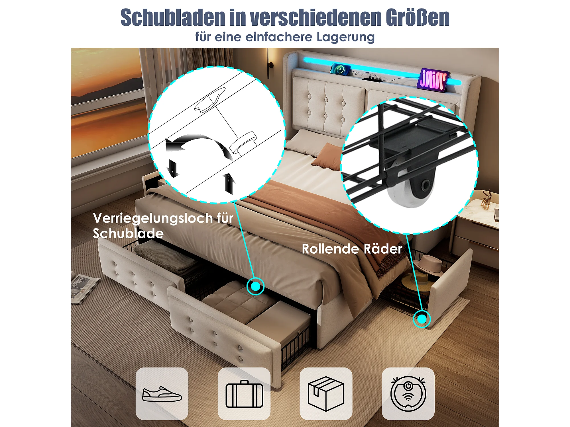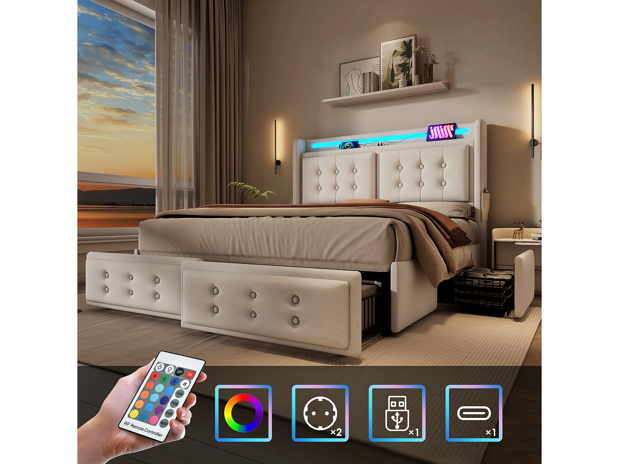 Lit double 160x200cm Beige Avec 4 tiroirs Avec LED et USB Tête de lit ouvrable