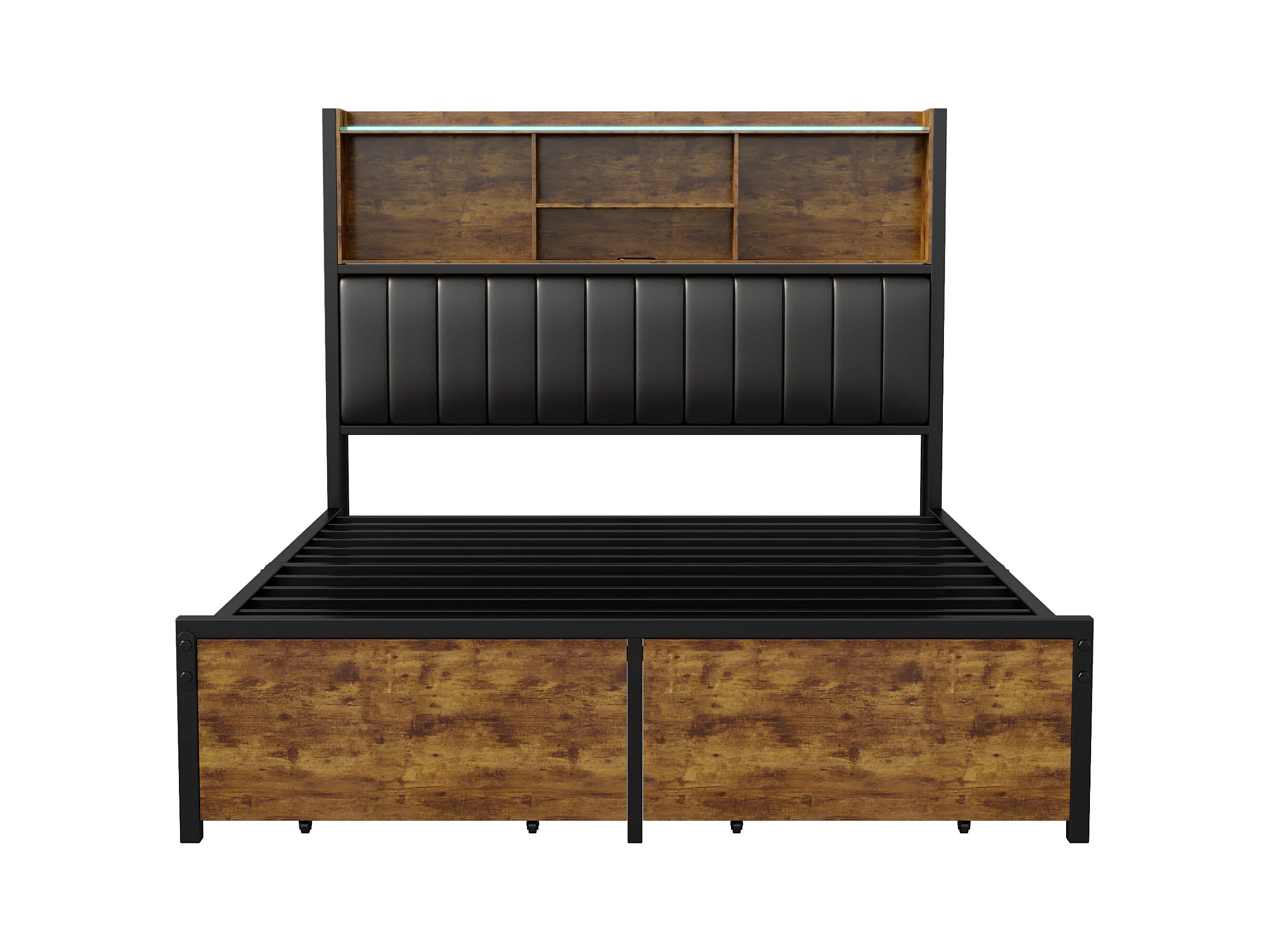 Lit adulte 160x200 cm avec sommier - tête de lit capitonnée avec USB LED et 4 tiroirs - similicuir - noir (sans matelas)