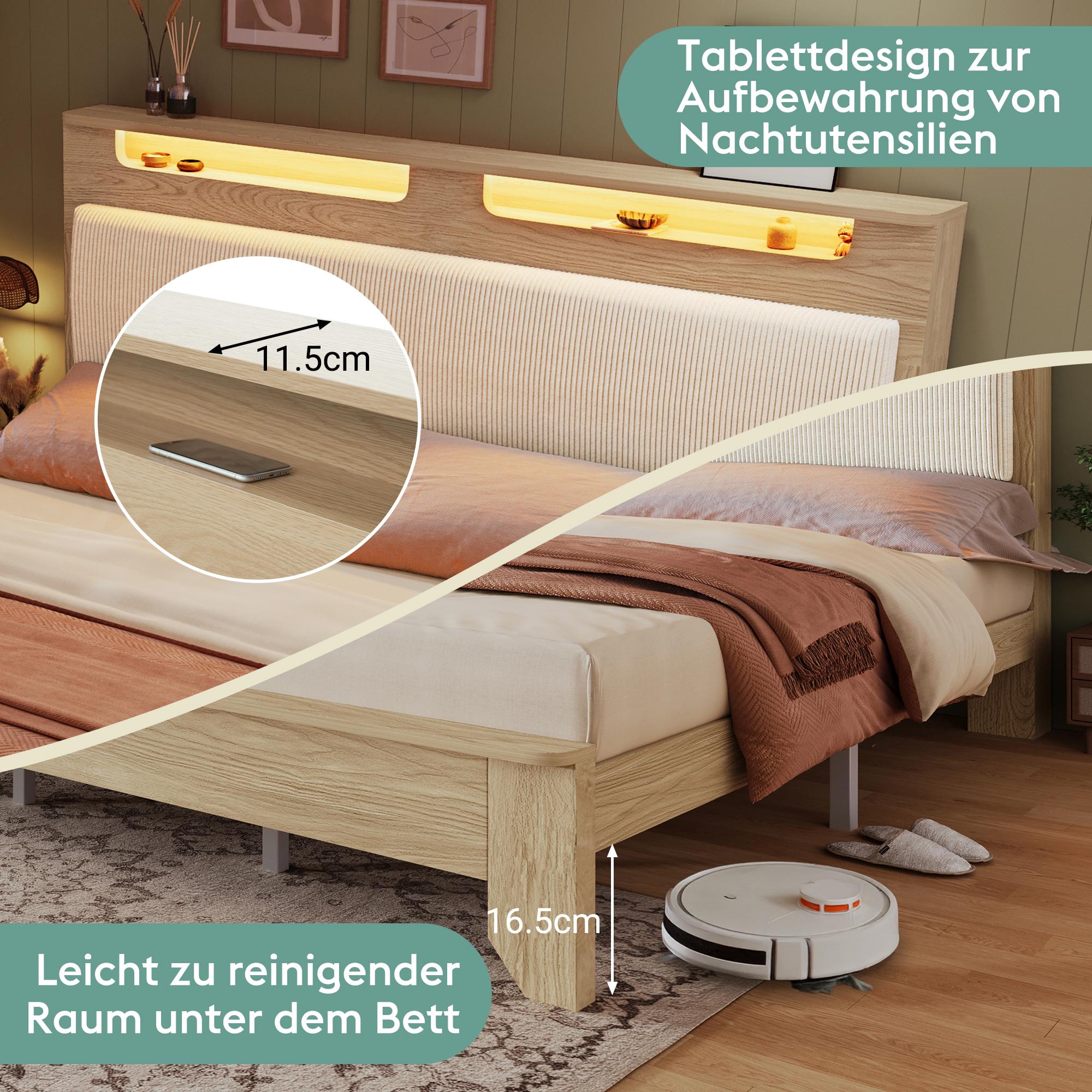 Lit double 160x200 cm avec tête de lit, LED et dossier en corduroy beige, cadre en bois avec lattes, bois clair (160x200x110 cm)