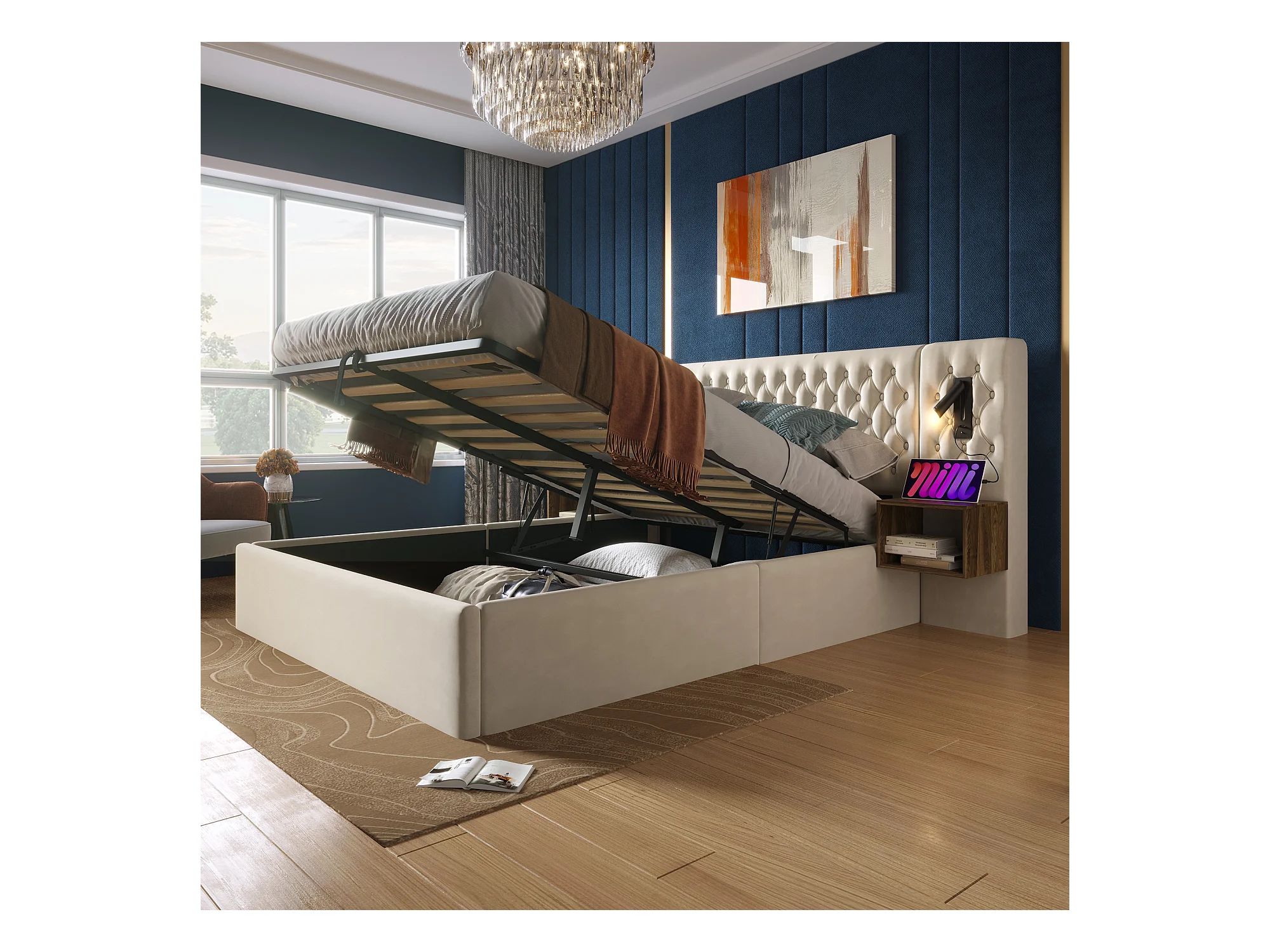 Lit double 160x200 cm avec tête de lit LED, rangement et 2 tables de nuit, en velours beige (213x247x105 cm)