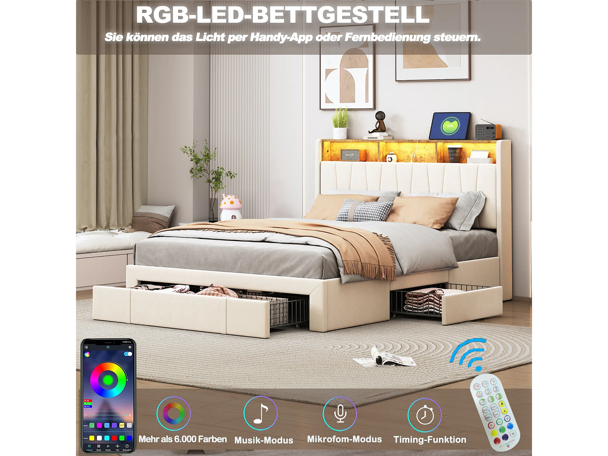 Lit double 160x200 cm en velours beige avec éclairage LED, ports USB & Type-C, et 4 tiroirs de rangement en métal – Lit moderne pour adulte et adolescent